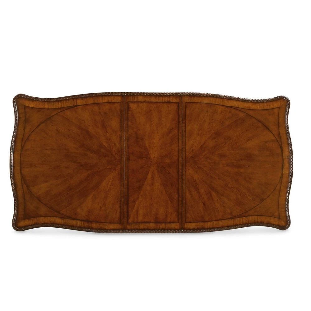 The spectacular top of the Old World Leg Dining Table is decorated with book matched cherry veneers in a sunburst design bordered by herringbone inlay and set off with avodire cross banding. The tabletop edge is finished with leaf carved gadroons and the generously scaled cabriole legs are fully carved with shells, acanthus leaves and beads, terminating in gracefully scrolled feet. With the addition of two 18″ leaves (included) the table can be expanded to seat ten; the leaves have folding apron rails to facilitate storage in the Old World Wine and Cheese Sideboard. The Old World Leg Dining Table works beautifully with the Old World Upholstered Back Chair or the Old World Shield Back Chair.