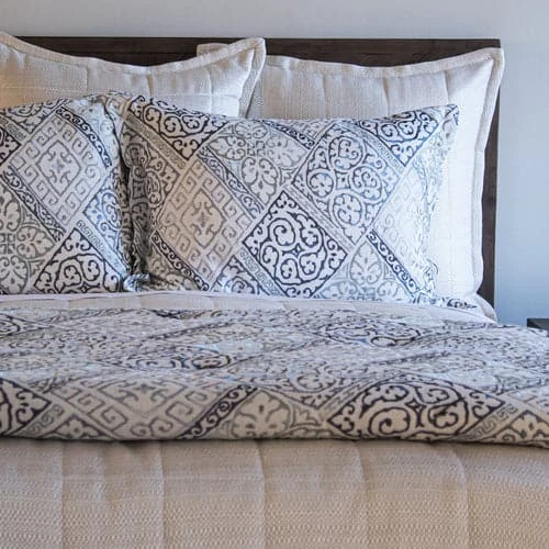 Oporto is a celebration of blues in an offset square tile pattern. Oporto throw reverses to plain white ground. The throw is padded and tacked with graham ties.