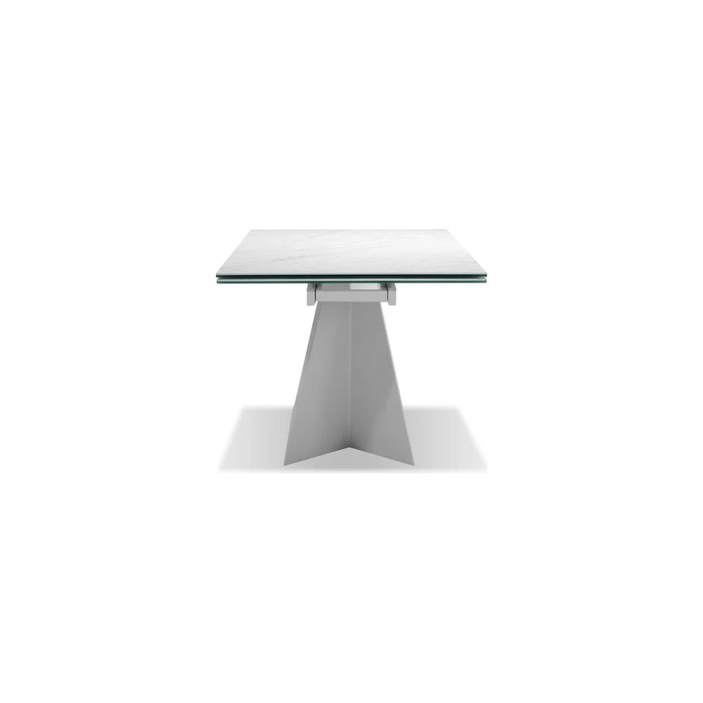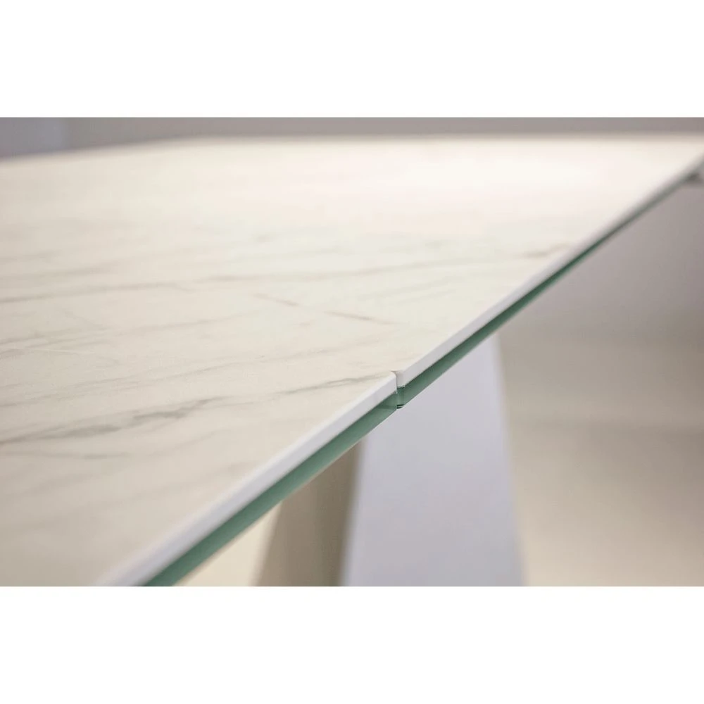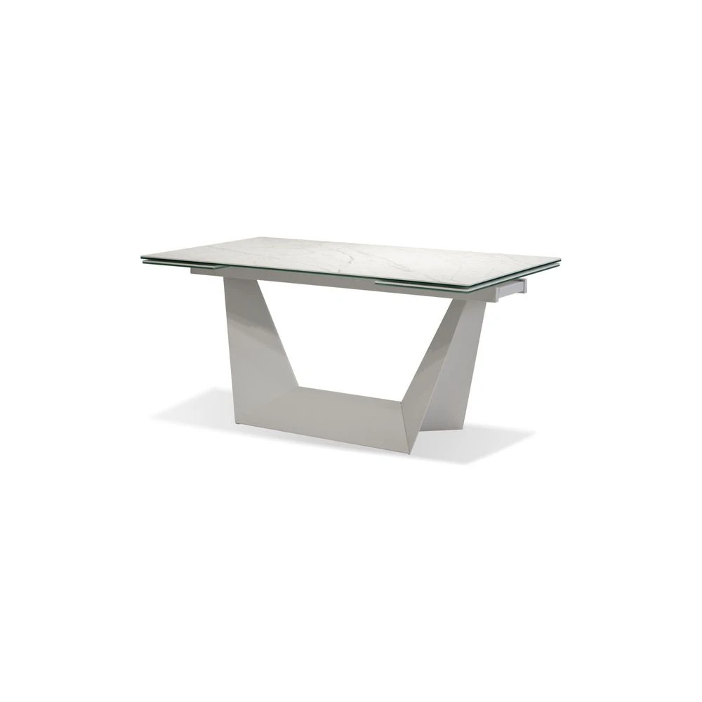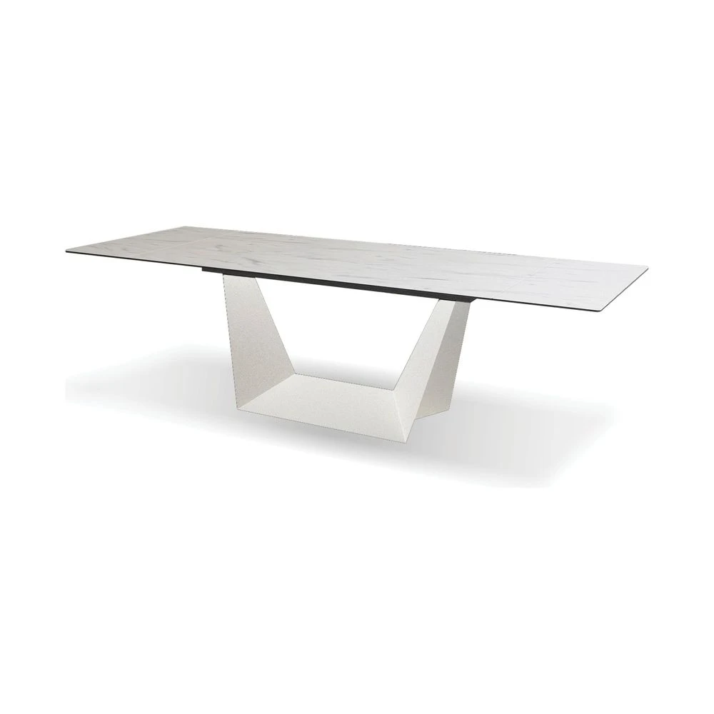 Description: THE ORIGAMI DINING TABLE HAS TWO MANUAL EXTENDING LEAFS THAT ARE SELF STORING UNDER THE TABLE. IT IS MADE WITH A WHITE POWDER COATED STEEL BASE AND THE TOP IS MADE FROM CERAMIC AND GLASS THAT IS LAMINATED TOGETHER. THE CERAMIC HAS A MATTE TEXTURED FINISH AND LOOKS LIKE REAL CARERRA MARBLE. THE CERAMIC IS SCRATCH PROOF AND STAIN PROOF AND IS EASILY MAINTAINED WITH SOAP AND WATER.