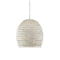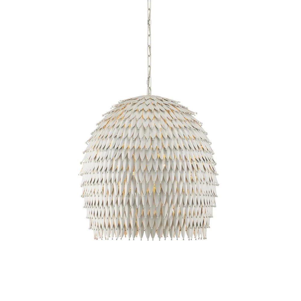 Description: The Overlay Large Pendant is a artisanal creation that is painstakingly made by hand, as each of the leaves are individually cut and welded to the frame and the dots on the edges of the spiky cut-outs are welded on. The elongated-dome shape of the white pendant has a sartorial feel thanks to the textural richness of the fluted edges flowing downward like a couture wedding dress might. Adjustable from 32″ to 100″ with use of included chain/rod kit/cable. If your space calls for a longer drop, additional chain/rods/cable is available for purchase.