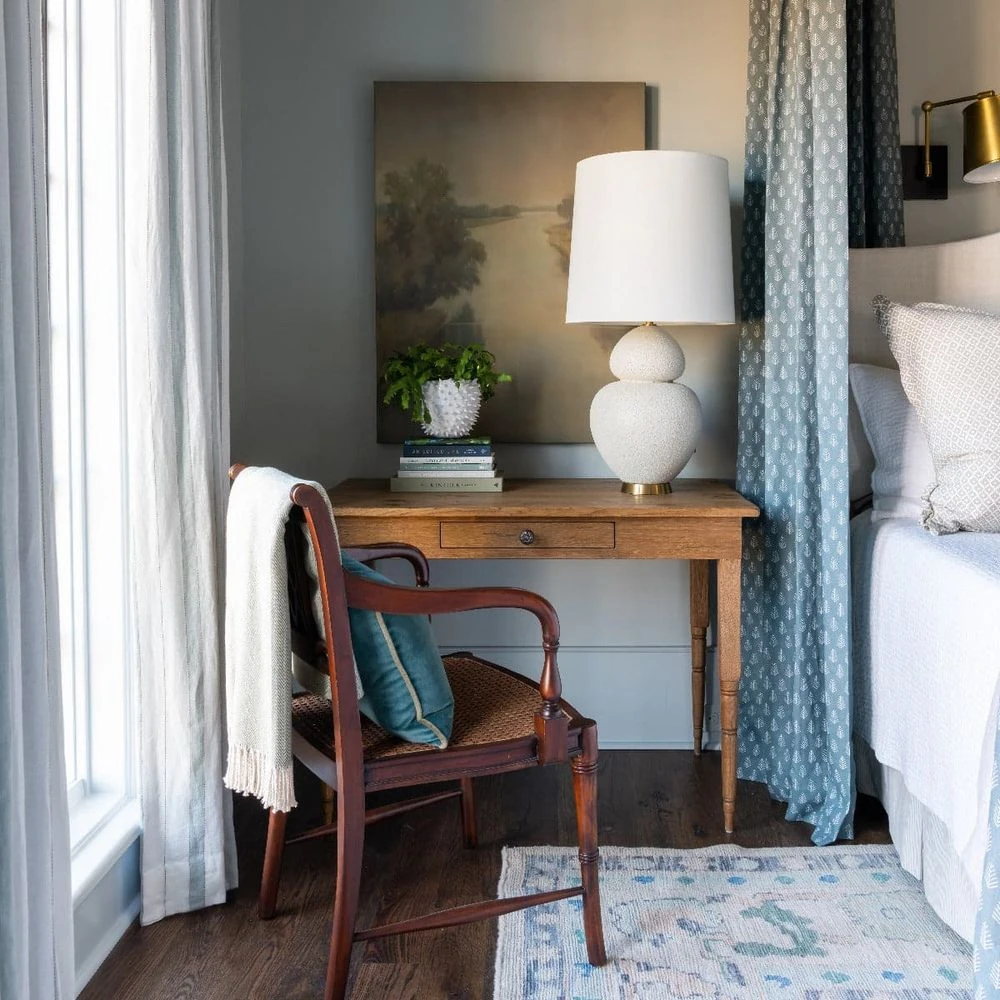 This understated design is adapted from late 18th century American colonial originals, sometimes called signing tables. A rectangular top rests on multi-ringed turned corner posts that flank an apron rail drawer.