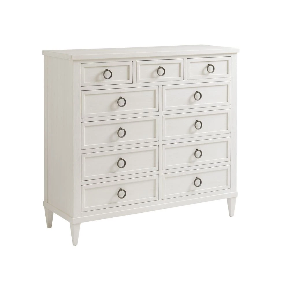 Marketing Copy: Ocean Breeze offers a fresh take on relaxed coastal living with transitional designs crafted from quartered mahogany in a beautiful shell white finish. Natural materials add textural interest and a feel of authenticity to the collection, including leather-wrapped rattan, woven raffia, braided lampakanai and Santa Cruz marble. Custom hardware and metal bases are finished in aged pewter, reinforcing the casual spirit of the designs.