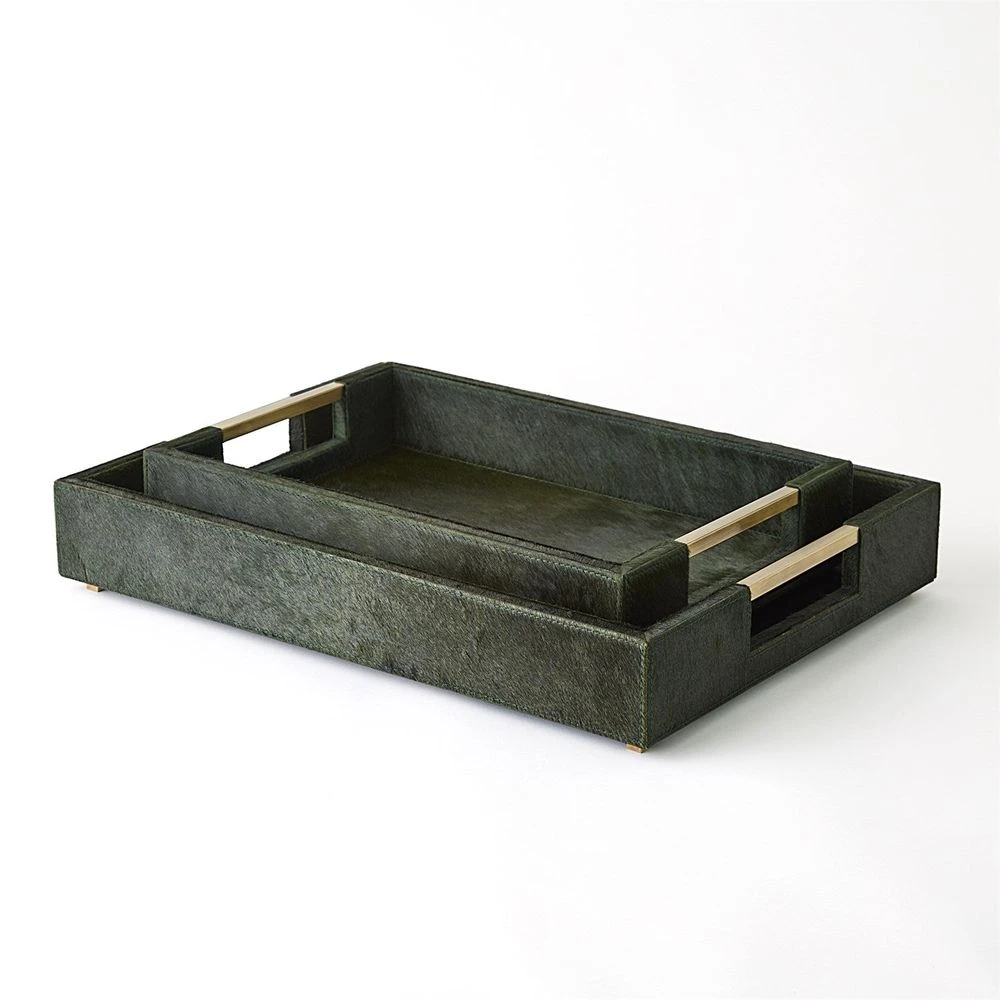 Description: The Posh Trays are luxuriously wrapped in green hair-on-hide leather blending practicality with sophistication in your living space. The collection features antiqued brass-finished handles and microsuede in the interiors of the boxes.