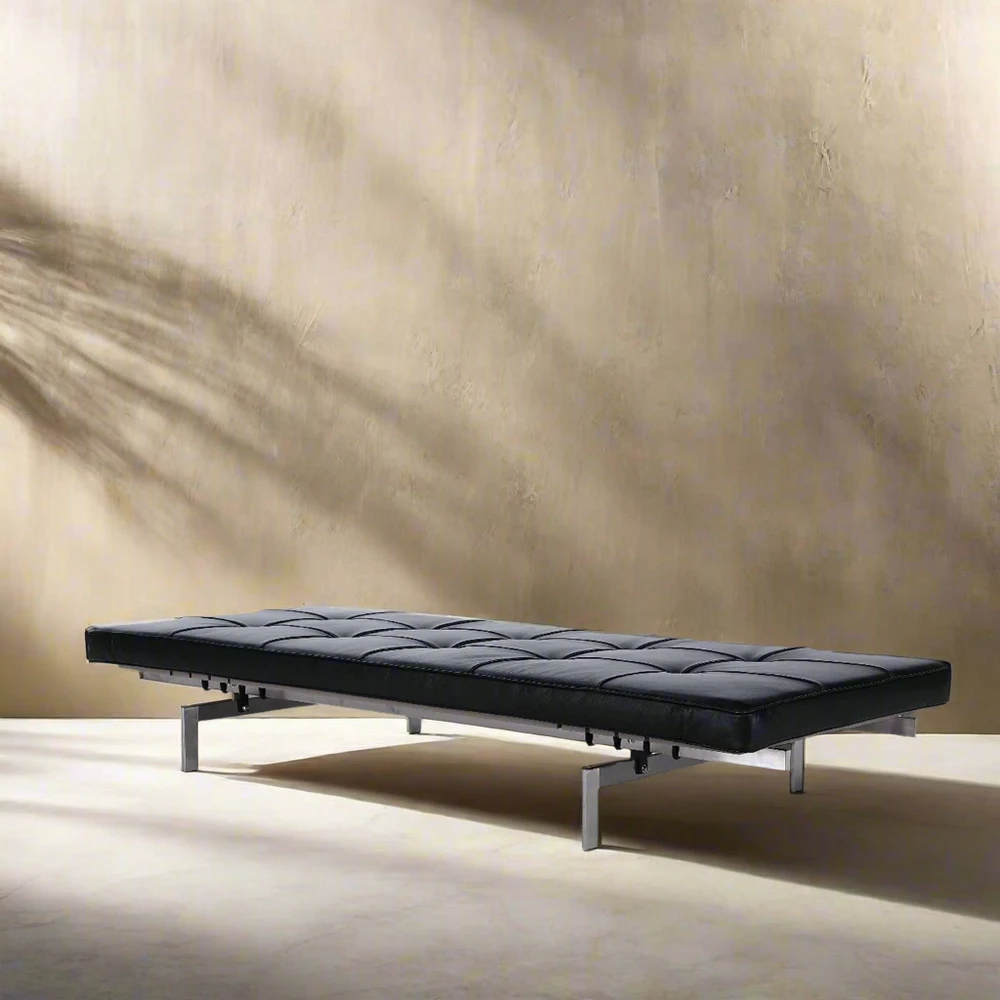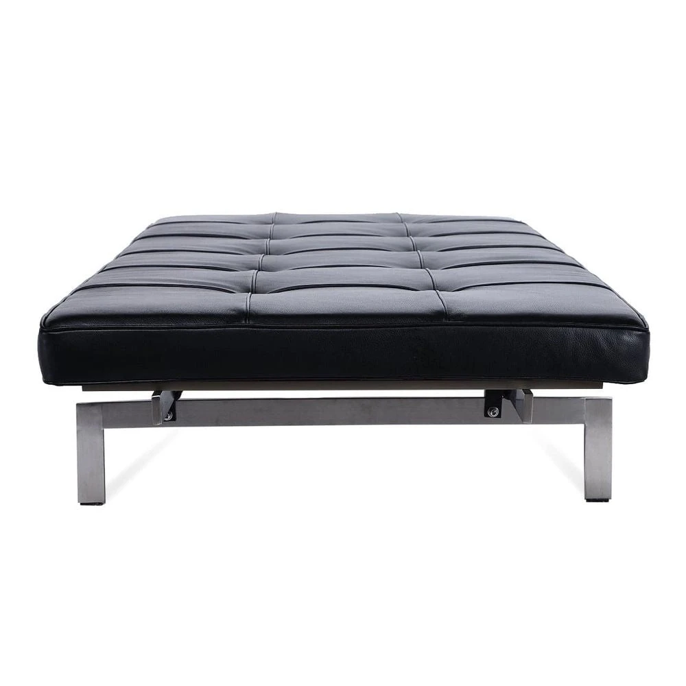 The Poul Daybed is inspired by the mid-century design of Danish designer Poul Kjaerholm. The Hand-stitched leather upholstery wraps around a comfortable high-density foam cushion. The Premium leather is an Italian aniline dyed leather that is finished with a summary-tufted grid. The sturdy and durable stainless steel frame has a brilliantly brushed finish.