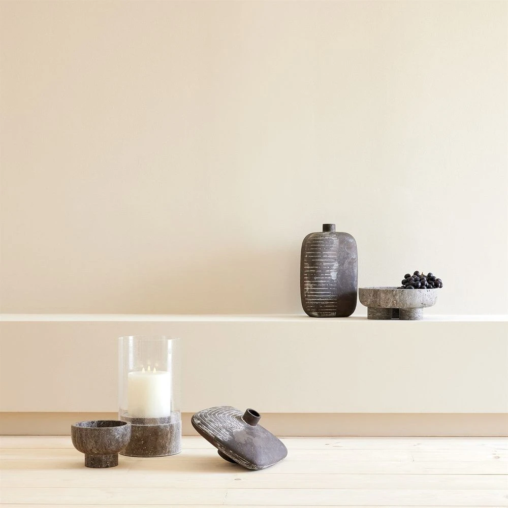 Description: The Priory Hurricane is expertly carved from a solid piece of titanium travertine, showcasing its natural beauty. It features a seeded glass hurricane that beautifully diffuses candlelight, creating a warm and inviting ambiance. As travertine is a natural product, please be aware that there will always be variations in veining and color. This is to be expected and makes every travertine product uniquely your own.