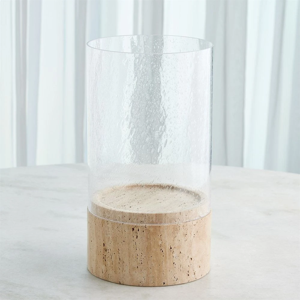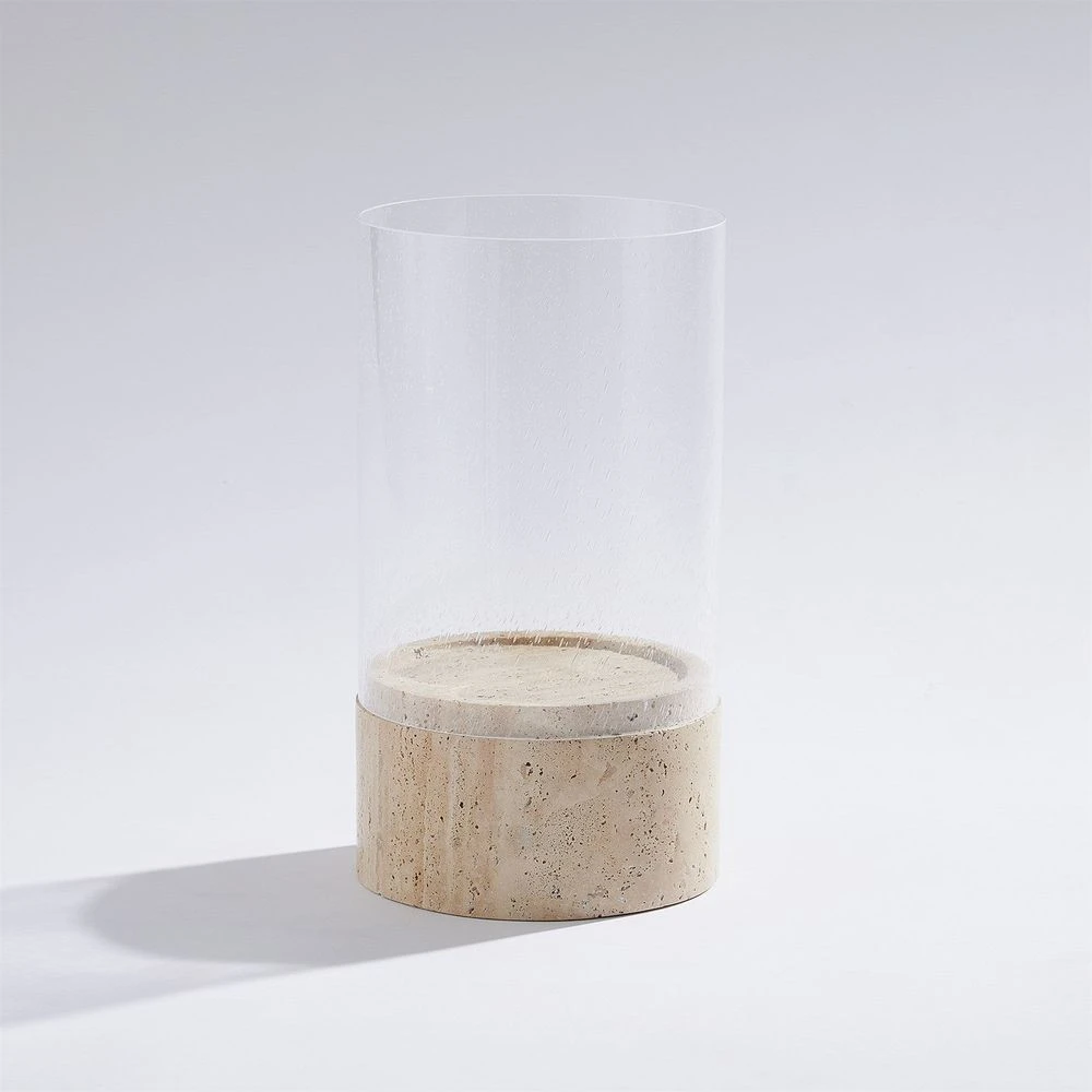 Description: The Priory Hurricane is expertly carved from a solid piece of travertine, showcasing its natural beauty. It features a seeded glass hurricane that beautifully diffuses candlelight, creating a warm and inviting ambiance. As travertine is a natural product, please be aware that there will always be variations in veining and color. This is to be expected and makes every travertine product uniquely your own.