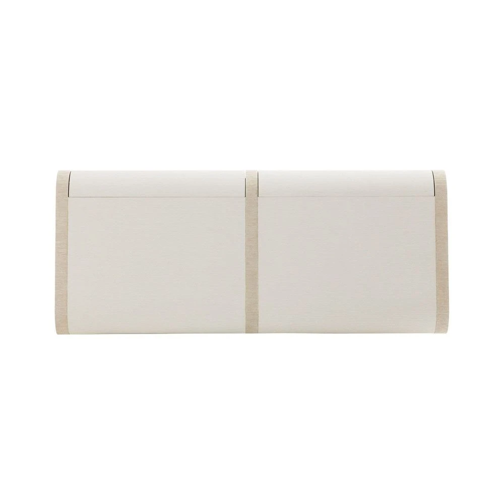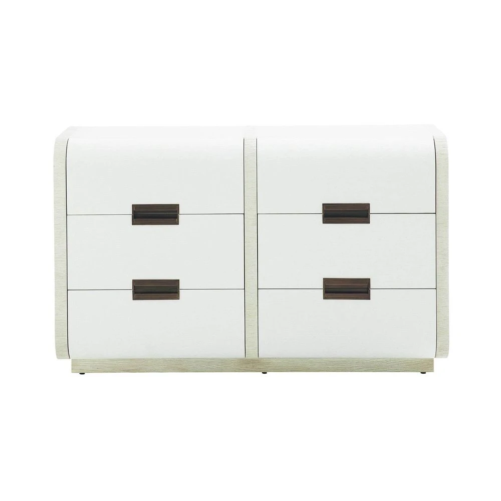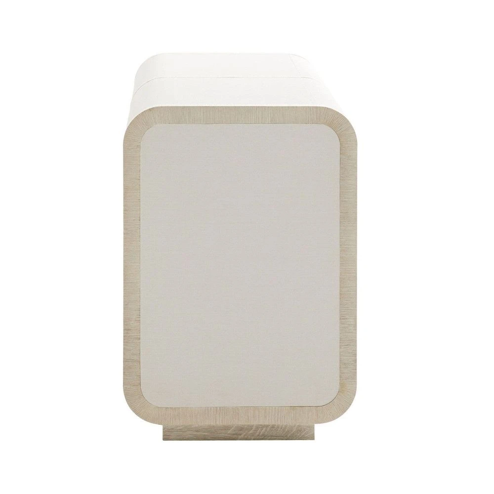 The Jovan brings a contemporary twist to a classic modern design. The beige seagrass cloth construction is met with a matching beige oak veneer and large bronze-finished brass hardware — a beautiful blend of tones and textures. The top of the chest is curved to follow the arched silhouette down to the drawers and further enhances its modern aesthetic. Wood and finish will vary.