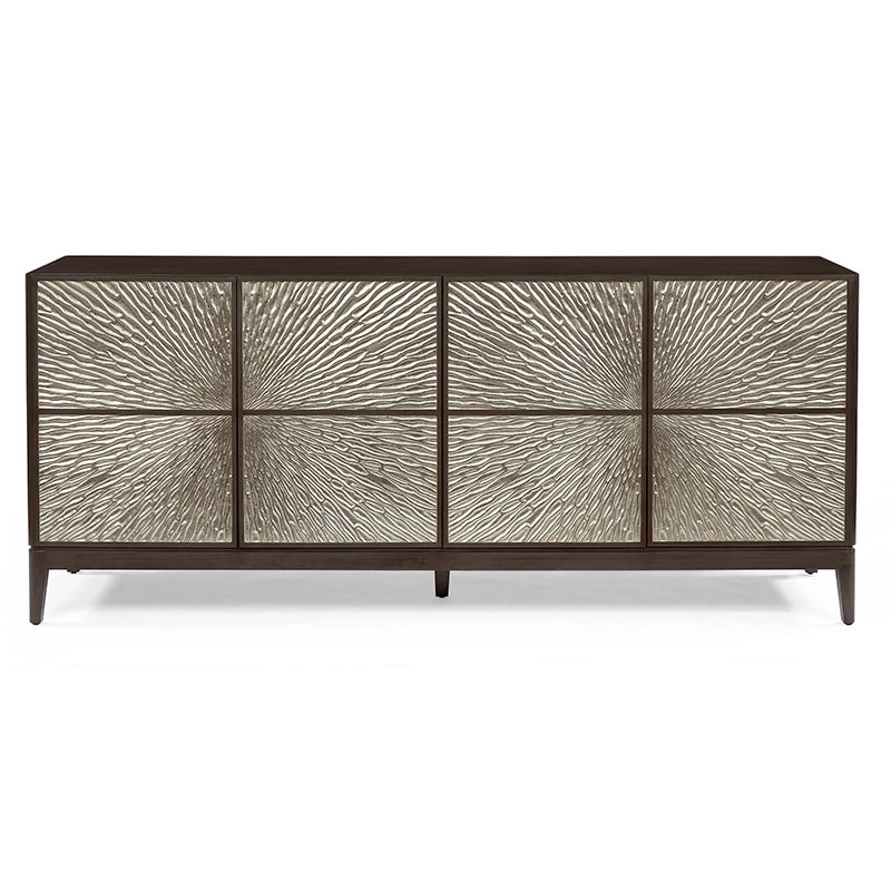 This impressively scaled case creates its interest in carved wood inlaid doors done in a radiating pattern that frame quartered oak veneer. Each pair of doors is centered with large plate pulls beautifully textured and finished in our artisan patina finish.
