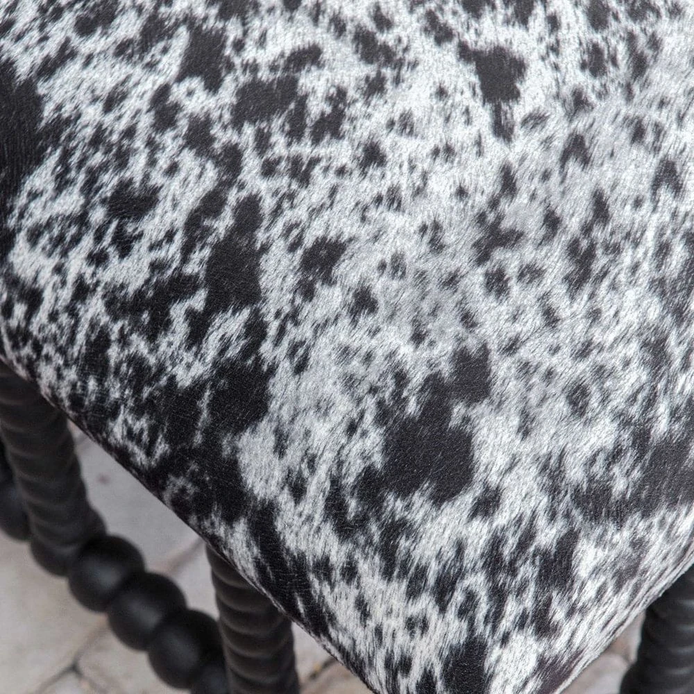 Ranch and modern lodge styles converge to create this plush, upholstered bench. The cushioned seat is wrapped in a charcoal gray and white faux cow hide, accented by a matte black stained base turned from solid plantation-grown mahogany wood.