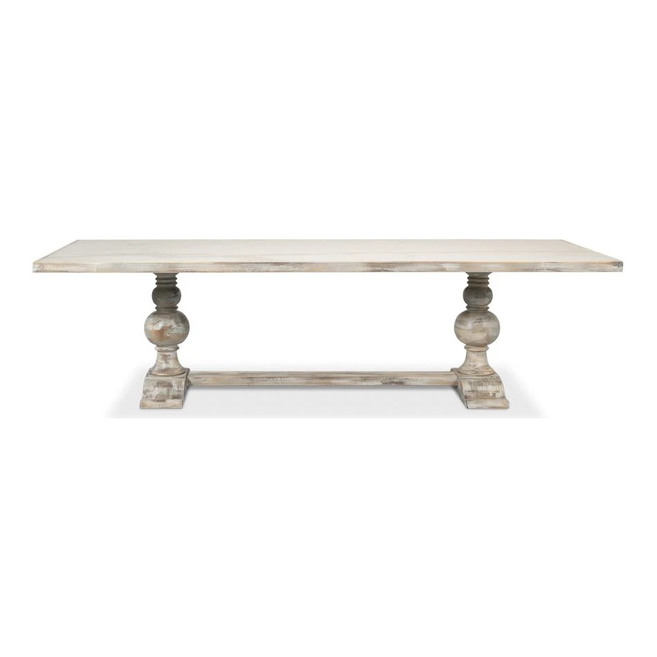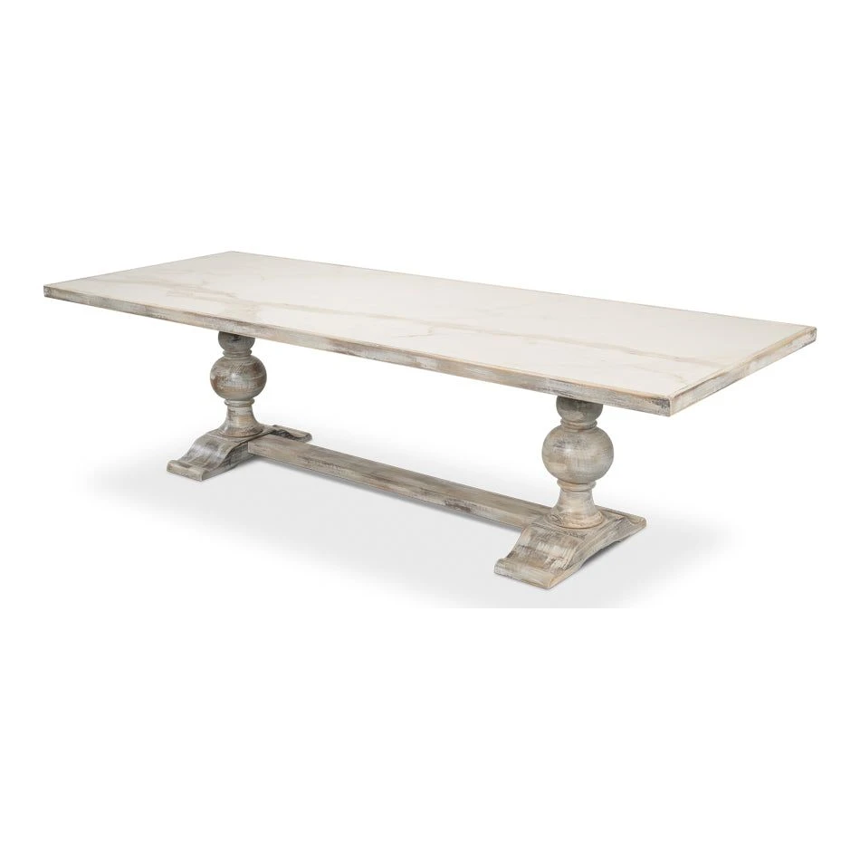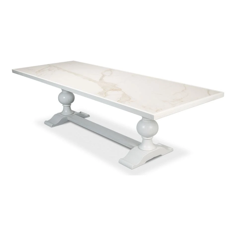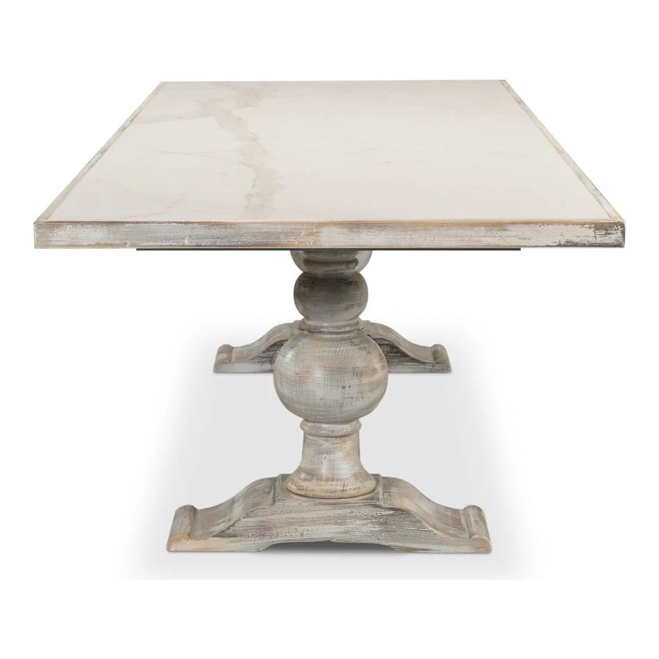 The beautiful trestle base supports an unexpected porcelain top fashioned to resemble marble.