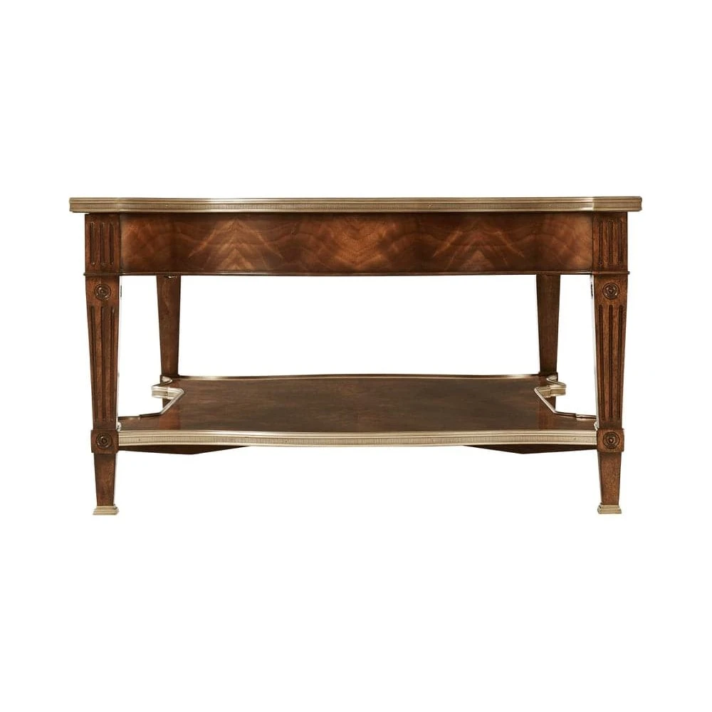 A flame veneered and solid cocktail table, the serpentine brass bound top above two drawers on each side centred by a leather inset slide drawer with a concealed drawer, all with brass Rocaille handles, on square tapering, fluted legs joined by a serpentine brass bound undertier.