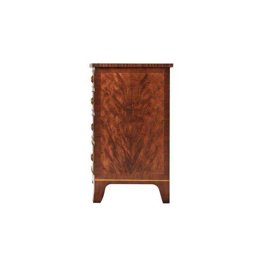 A mahogany, okume veneered and walnut banded nightstand chest of drawers, the bowfront top above four oval panel inlaid drawers on splay feet.
