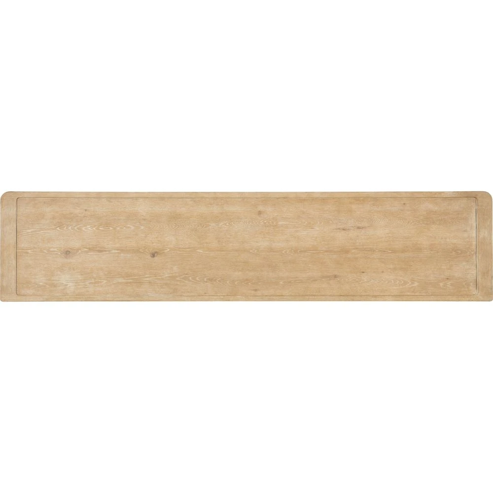 Description: Designed to help you emulate tranquil lake and ocean shore environments in your home, the Retreat Entertainment Credenza features the sand-colored Dune finish, transparent by design to showcase the unique grain patterns of the Oak Veneers. The 4 doors have soft-close hinges and magnetic door catches, with one adjustable shelf behind each pair of doors, a ventilated back panel and a 3-plug electrical outlet located behind the right-side pair of doors. Custom large round pulls in a soft pewter color add a dramatic detail.
