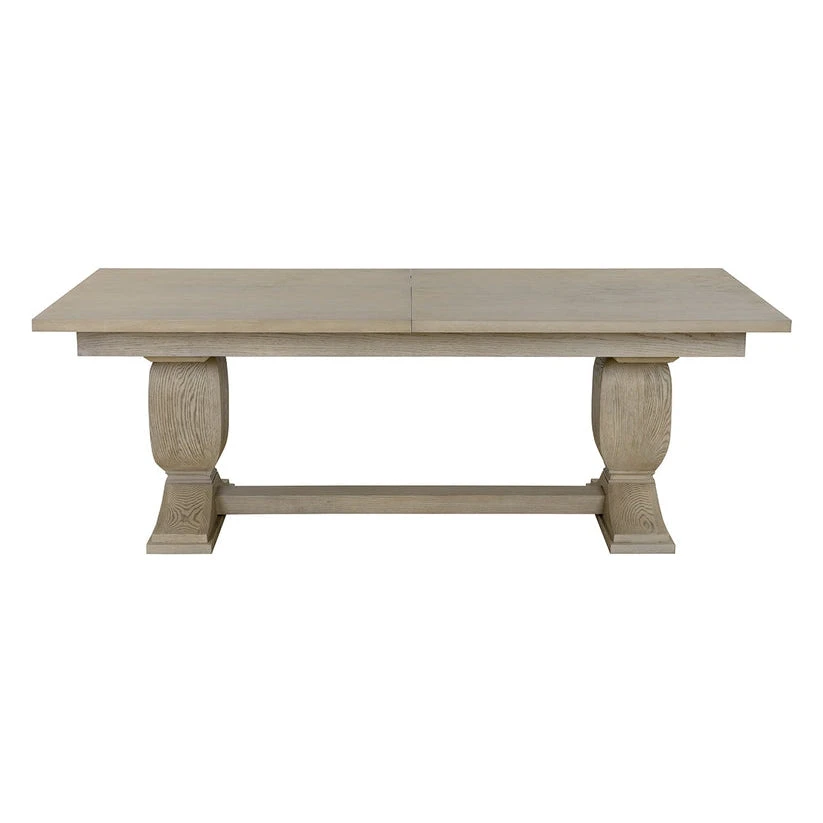 Inspired by architectural shapes and classic design, the Rhaenyra Extension Table brings an elegant presence to any dining space. Crafted from sand beige oak veneer with distinct graining across the base.
