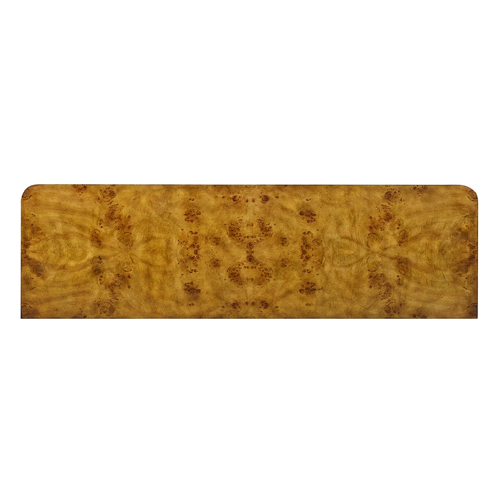 Description: Our Roland Dresser features a smooth top, rounded front corners, a shaped apron, three small and four large equal size storage drawers, round turned brass knobs, and brass accent foot plates; Rustic finish on Mappa Burl veneer.