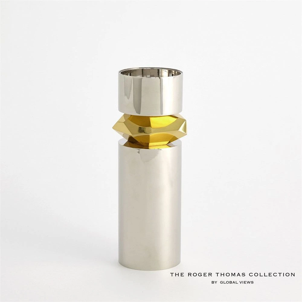 The Romano Nickel Candle Holder is made of nickel-plated brass and shiny brass. Holds 4 inch pillar candle.