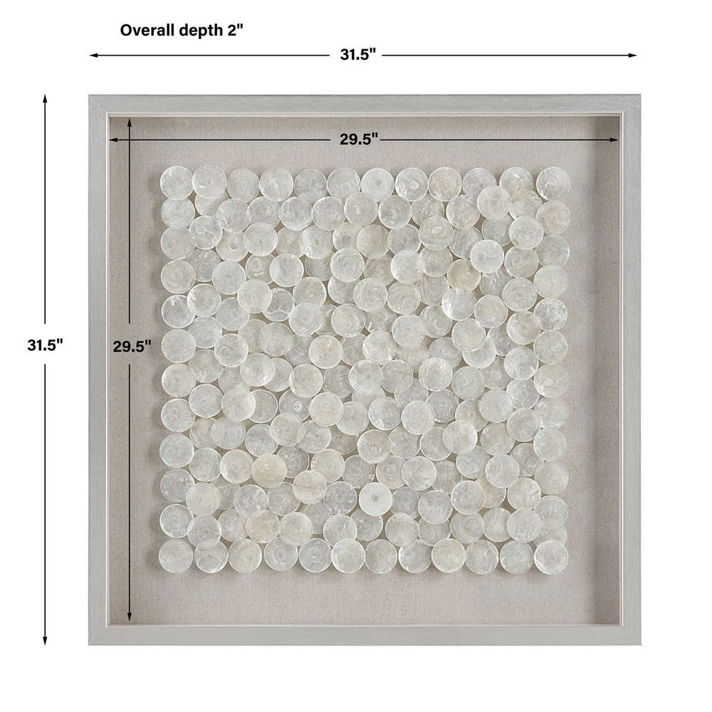 Known as the Windowpane Oyster for it’s transparent qualities, the natural layered capiz shells shimmer in this shadow box style wall piece. Placed over a flax toned linen backing in a pine wood frame finished in brushed silver.