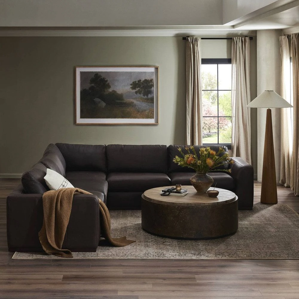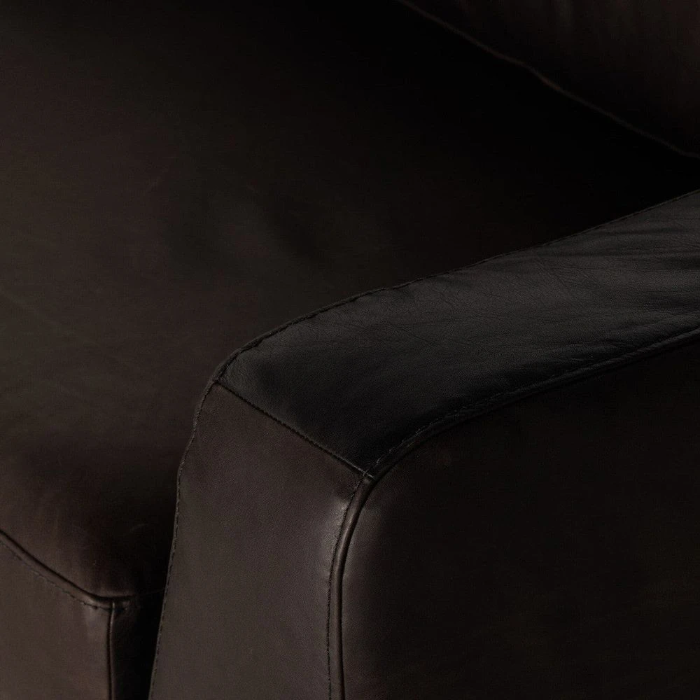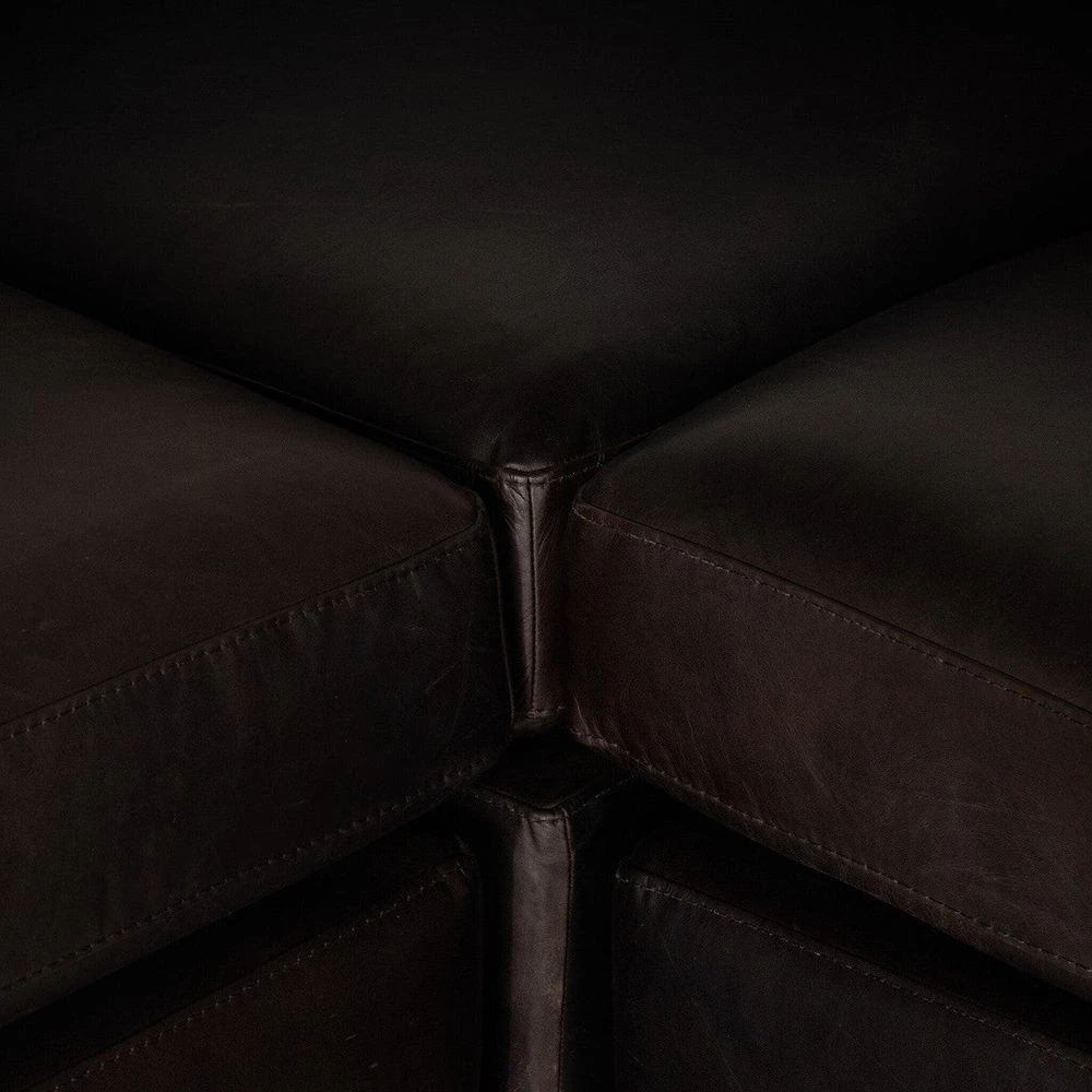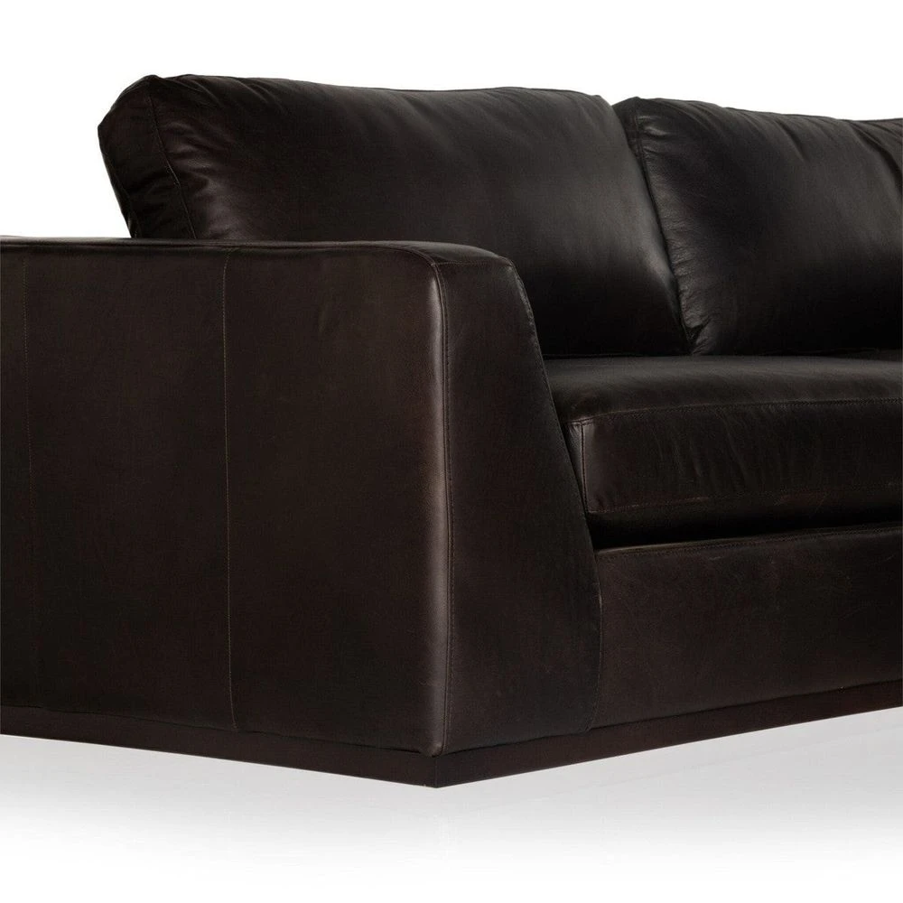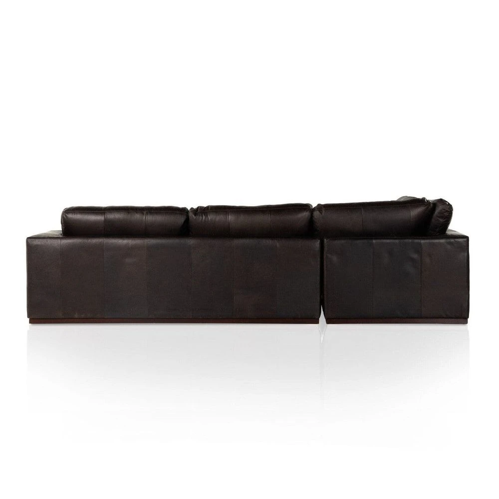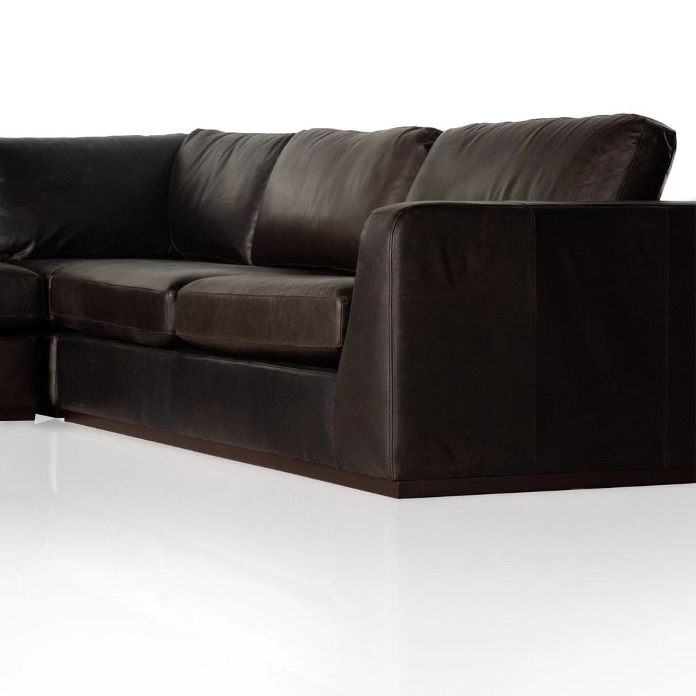 - Description: A simply styled sectional, perfect for everyday lounging. Rich top grain leather makes for a polished presentation, with subtly flared sides for shapely effect, all grounded by a wrapped plinth base.