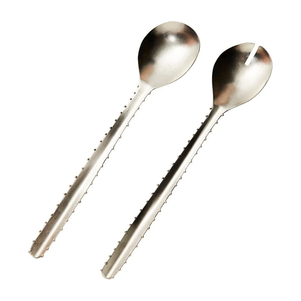 A pair of salad servers made out of brass and plated in silver or gold. The handles have tiny cactus dots that make a unique look. Ideal to use when serving from a generous salad bowl or platter. A really stunning pair. Handmade. Hand wash only.
