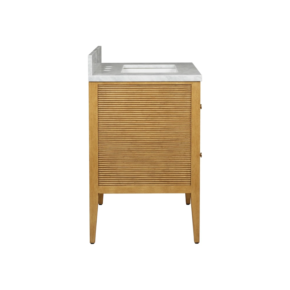 Description: The Santos 28″ Sea Sand Vanity has a split rattan pattern on the drawers and sides made by hand and applied to a solid mahogany frame. Then a Sea Sand finish covers the entire piece. Two sets of pulls are included in brass and polished nickel finishes to allow some customization. The vanity has two working drawers, the bottom of which has a removable organizational divider. The white Carrara marble top is fitted with a white rectangular undermount sink. Other fine design attributes include soft-close drawers and a removable matching marble backsplash.