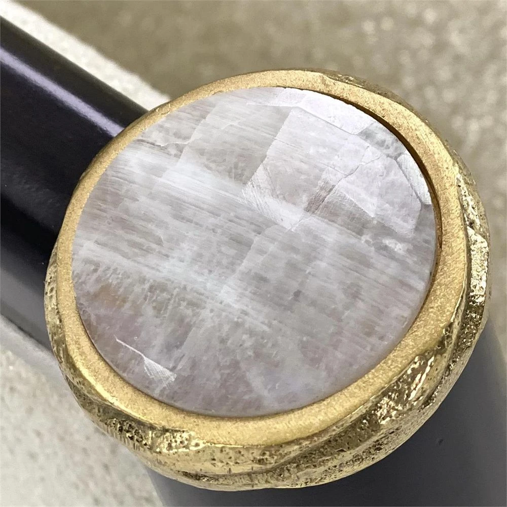 Sapphire Chair shown in V242 Espresso finish and 5017 fabric. This deco-inspired chair is finished in espresso. It features decorative arm caps made from faceted moonstones set in a satin brass bezel. The graceful legs are enhanced with satin brass ferrules. It has a channeled inside back and is upholstered in a beige velvet with a slight metallic shimmer. The outside back is detailed with a tonal welt trim. A matching back pillow is included.