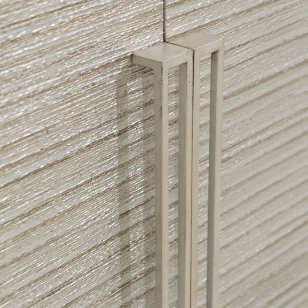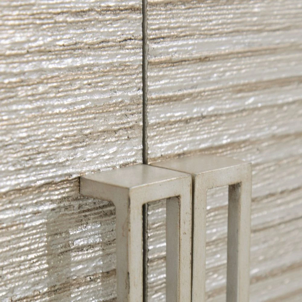 Description: The four-door Alden Credenza has a case in Espresso Celtis and is mounted on steel base in antique silver. The doors are inlaid with a continuous pattern of striated lines of varying silver tones and the linear hardware is finished in antiqued silver.