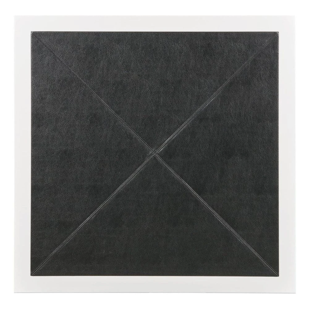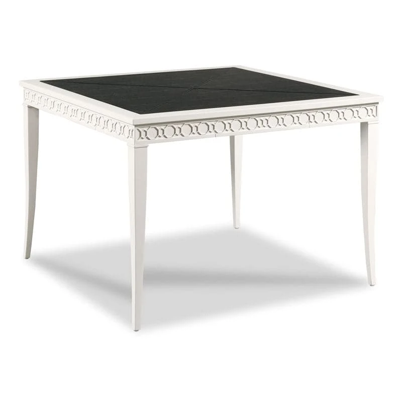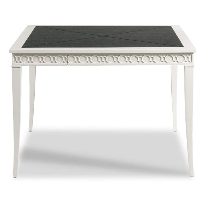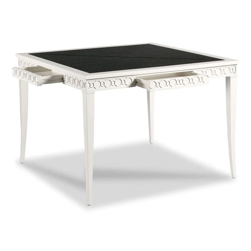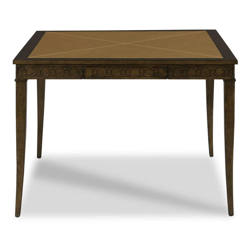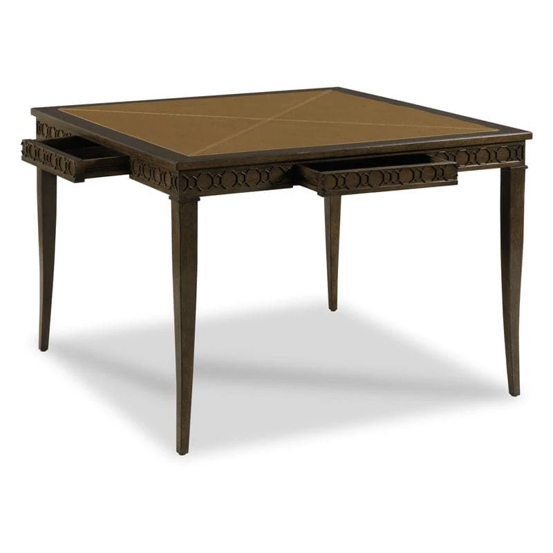 A framed square top inset with Pindler Bukaroo Buckskin over apron rails that feature a pierced fretwork fitted with game piece drawers on each side. The table is raised on squared posts that terminate to