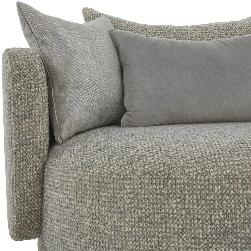 The Serena Swivel Lounger is a gorgeous contemporary seating solution that imbues a space with lavish tones and sleek curvature. Showcasing a stunning rounded profile, this swivel lounge chair is upholstered in Poplin Granite 5019 fabric, with welt trim in Noble Platino 2156. A rounded, stainless-steel base with a polished finish tastefully complements the neutral tones of the upholstery, completing the look. The piece comes with five throw pillows of varying shapes and sizes.