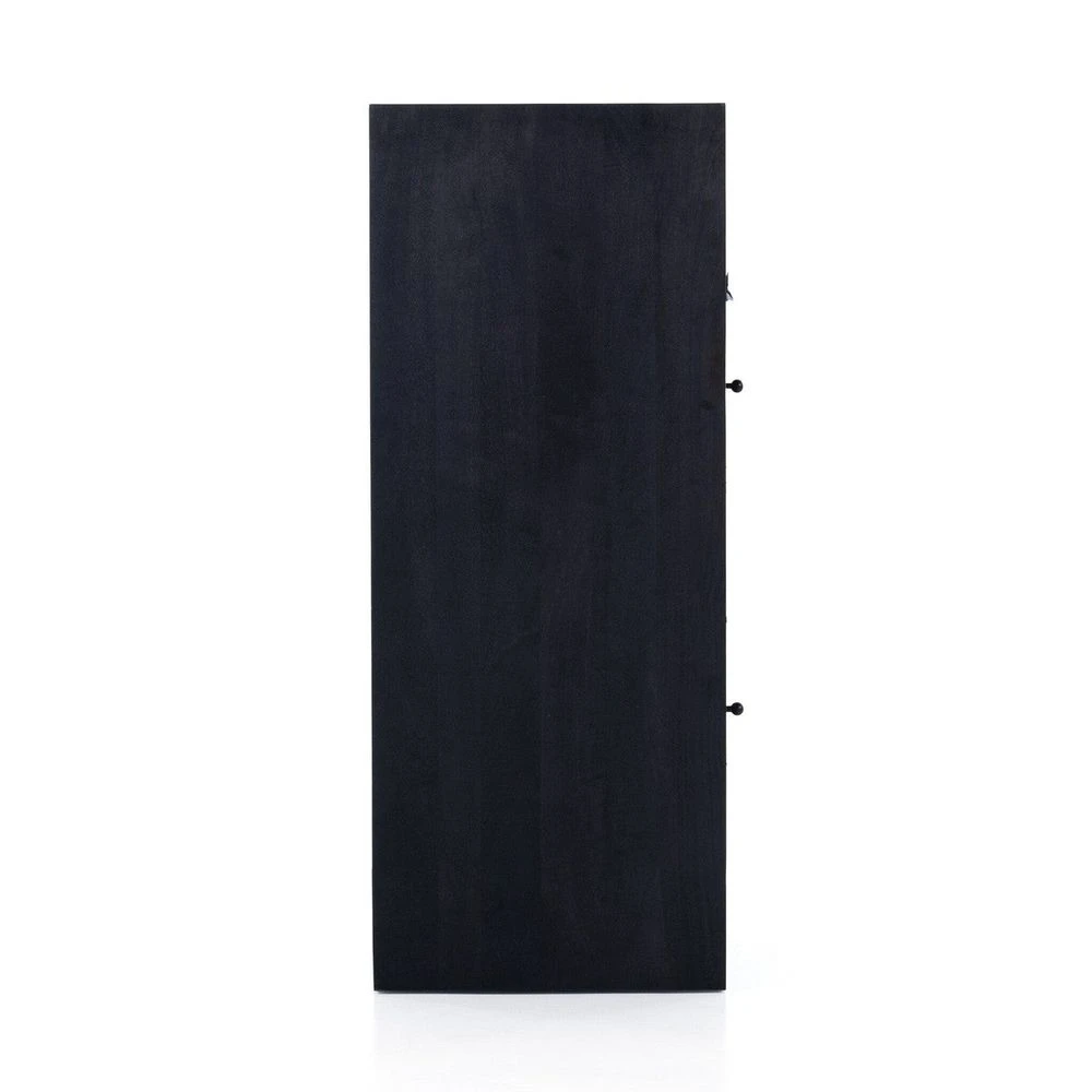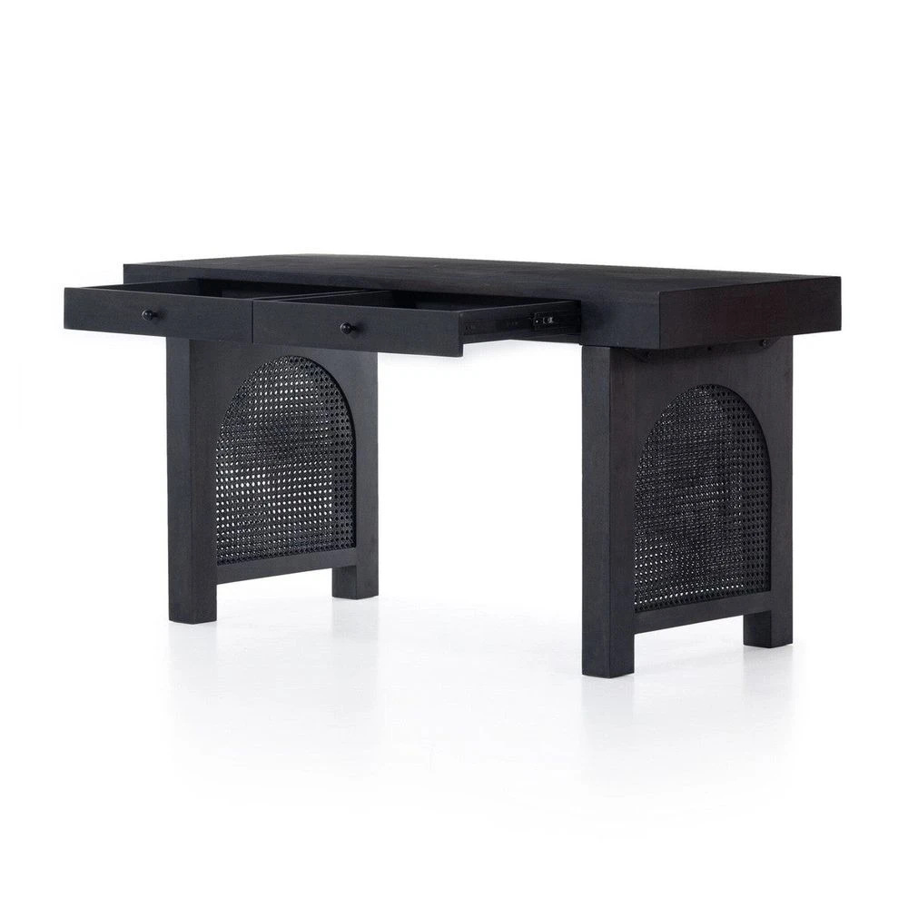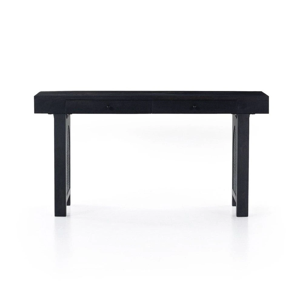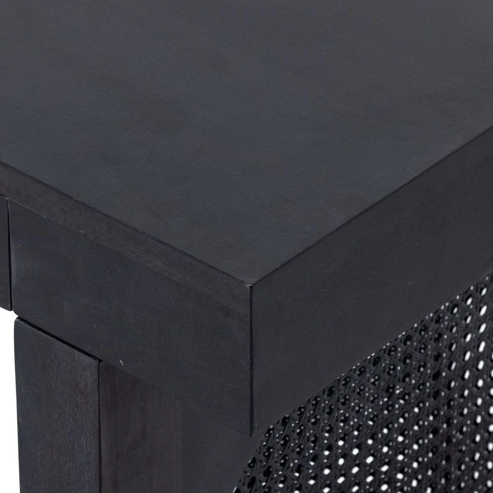 - Description: Black-washed mango encases textural cane door panels featuring black-finished iron hardware, meeting a forward-thinking material mix with sleek monochromatic vibes. Dual drawers keep frequently used office materials in close reach.