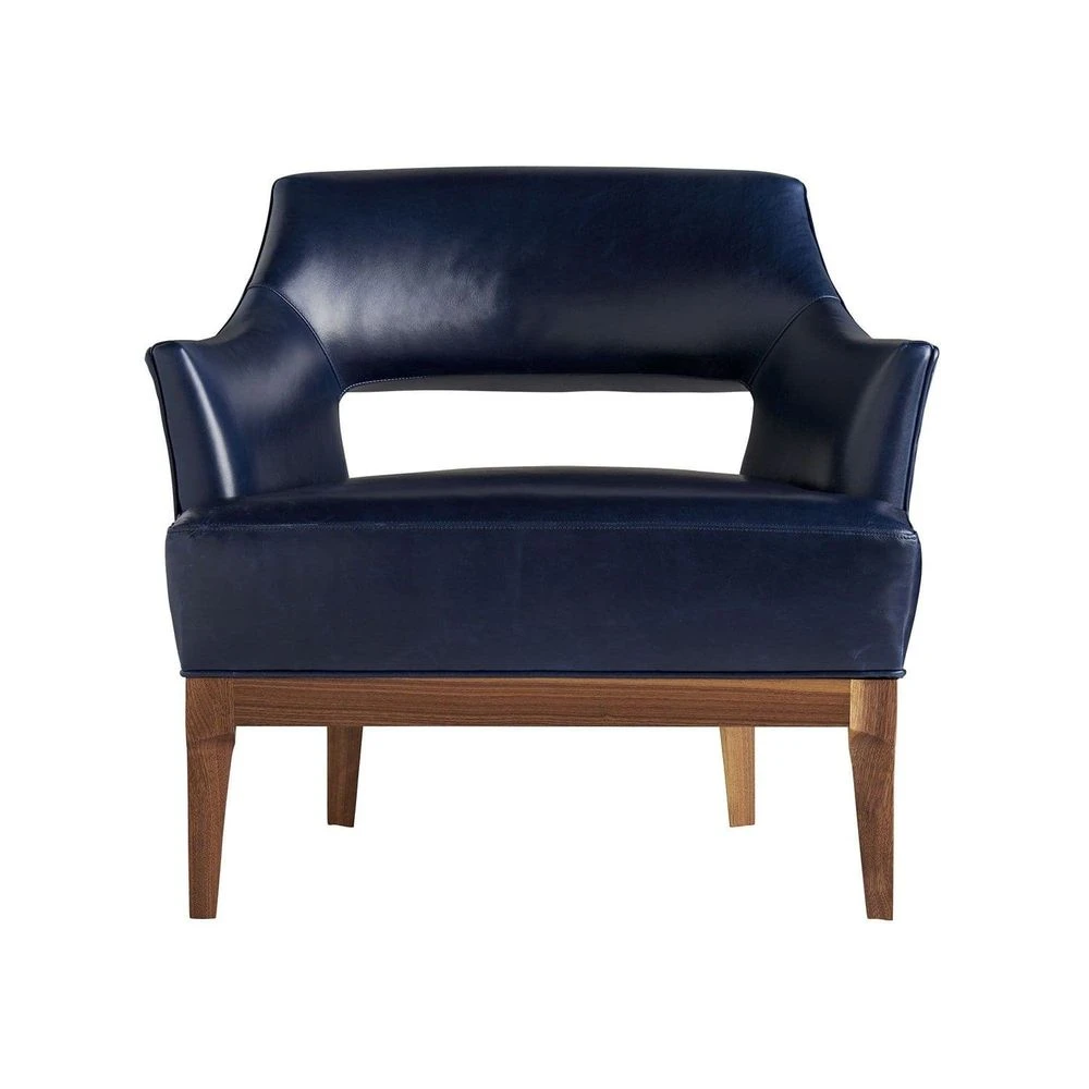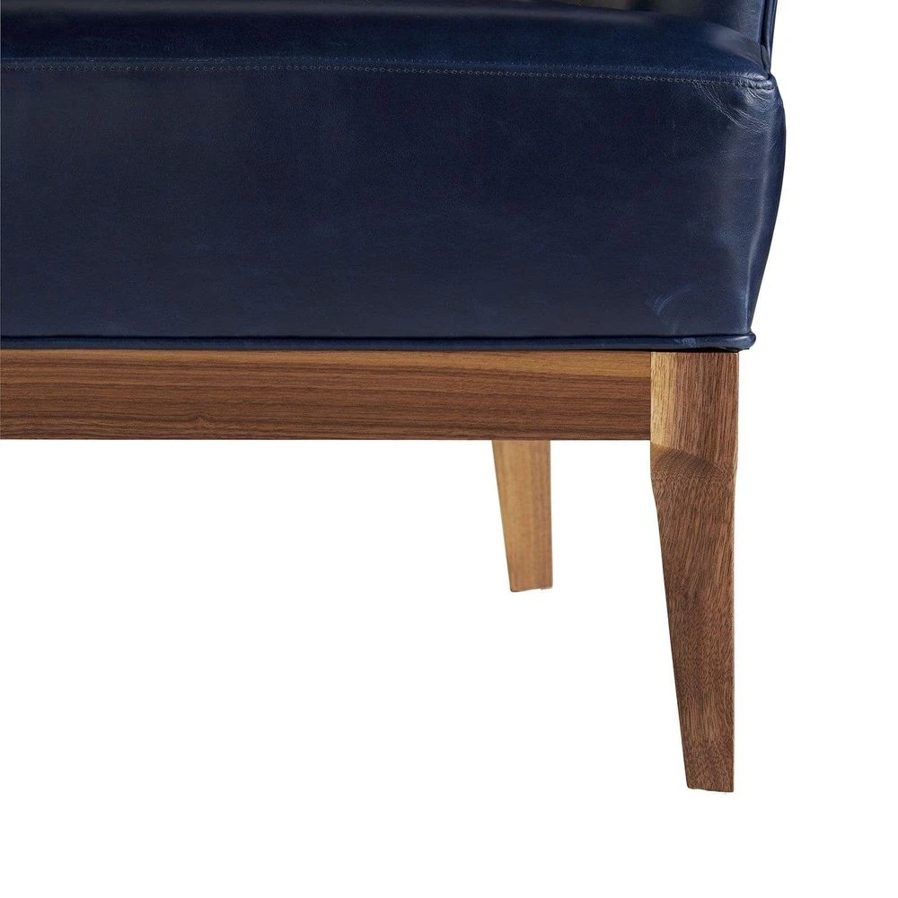 Experience the ultimate combination of style and comfort with the Siena Chair. Its high back, sloping arms, and deep seat provide maximum support for everyday use. The luxurious indigo leather and beveled walnut base add an elegant touch, while the modern opening on the back adds a unique edge. This versatile piece is perfect for both formal and casual settings, making it a must-have for any sophisticated space.