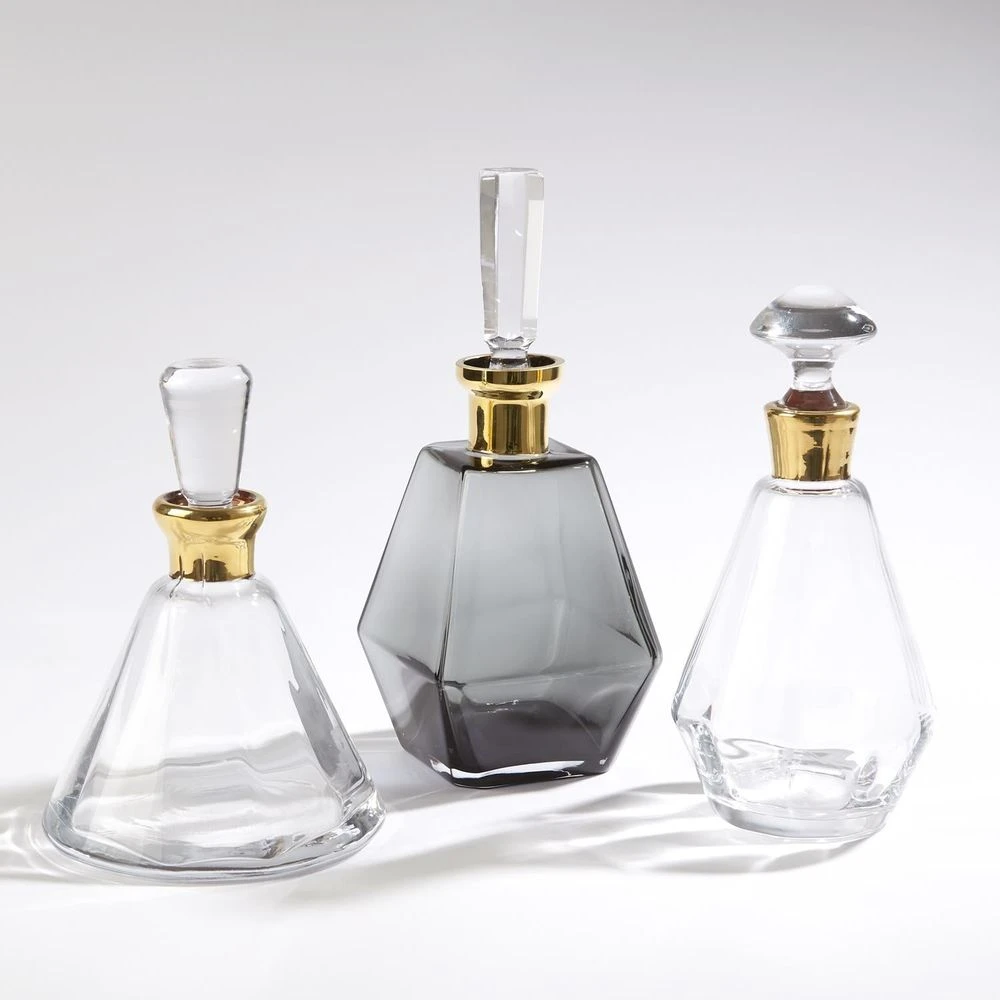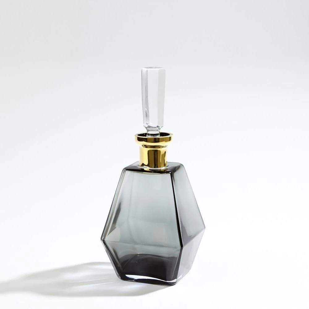 Description: Crystal clear glass has been shaped to form our optic and chic Prism Decanter. A radiant 24k band has been added for a touch of opulence.