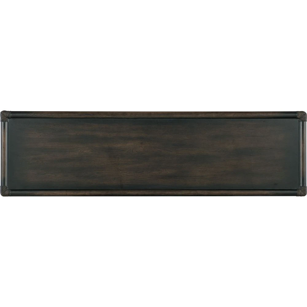 Description: Inspired by tropical getaways, the Solace Pole Rattan Dresser is a blend of natural materials in a laid-back, versatile design. Crafted of Oak and Maple Veneers with Rope accents, the dresser is finished in Black Sand, transparent by design to reveal the unique grain patterns in the wood veneer. Offering six self-closing drawers, the top left drawer has a removable felt liner and the top right drawer has a removable felt liner. The bottom two drawers are cedar-lined. The textured, pewter-colored bar pulls add a look of natural elegance.