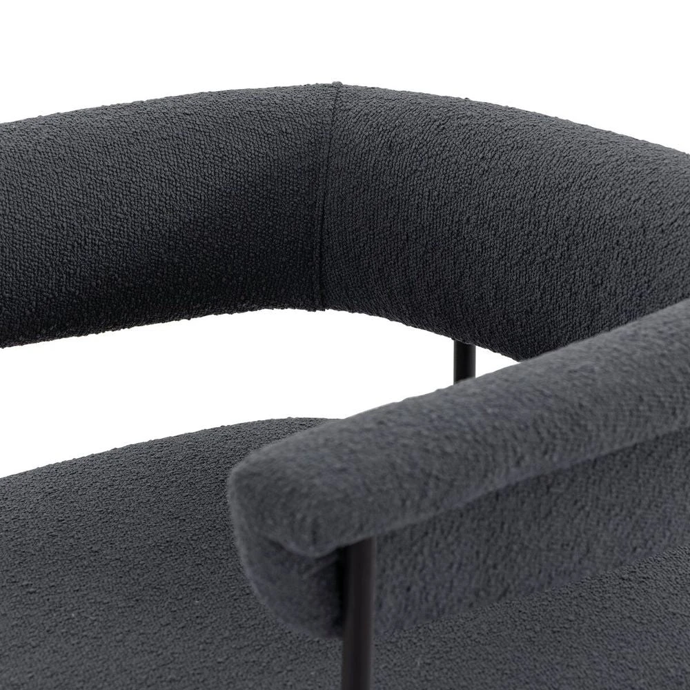 Airy and light with slim, black-finished iron framing, slate-colored performance boucle lends texture to a beautifully sculpted counter stool featuring a yoke back plus fold detailing. Easy to clean and made from fully recyclable materials, Fiqa fabrics are machine-washable, stain-resistant, water-repellent and antimicrobial.