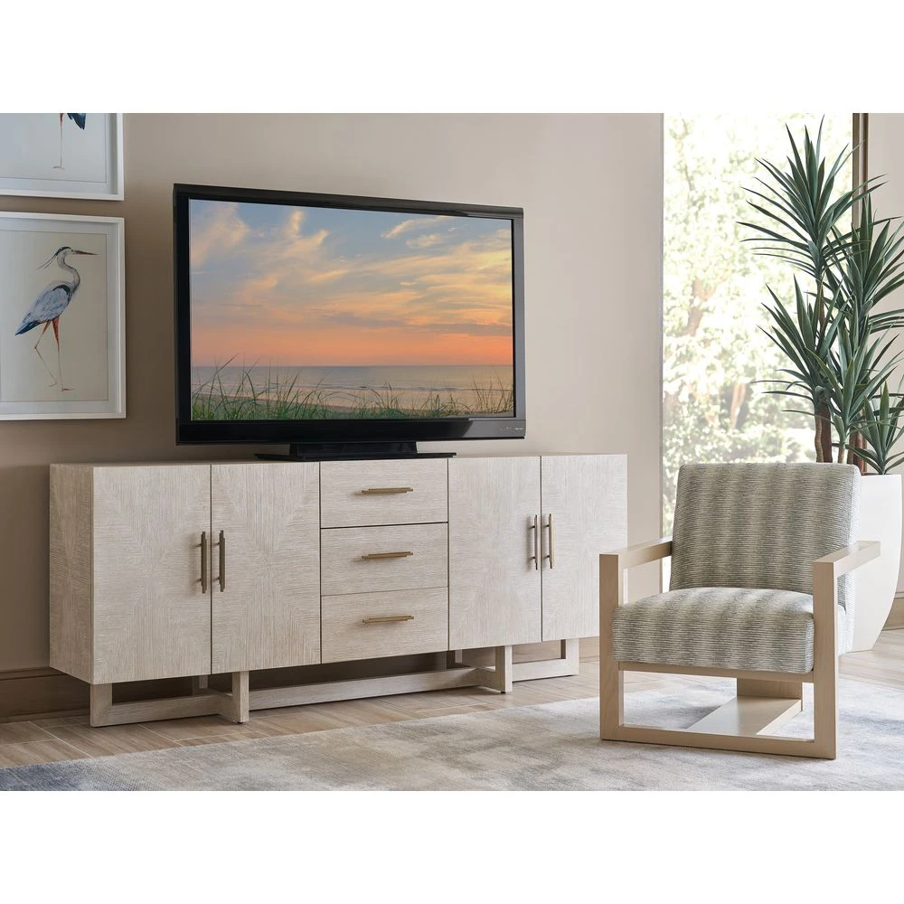 Marketing Copy: The Silverstone collection features designs with strong contemporary lines, crafted from white oak in a light taupe finish. Surfaces are gently sandblasted to enhance the natural grain patterns and then highlighted with an ivory ceruse. Custom hardware is finished in a soft champagne coloration. The stiking architectural styling and light finish offer a fresh take on contemporary office and media designs.