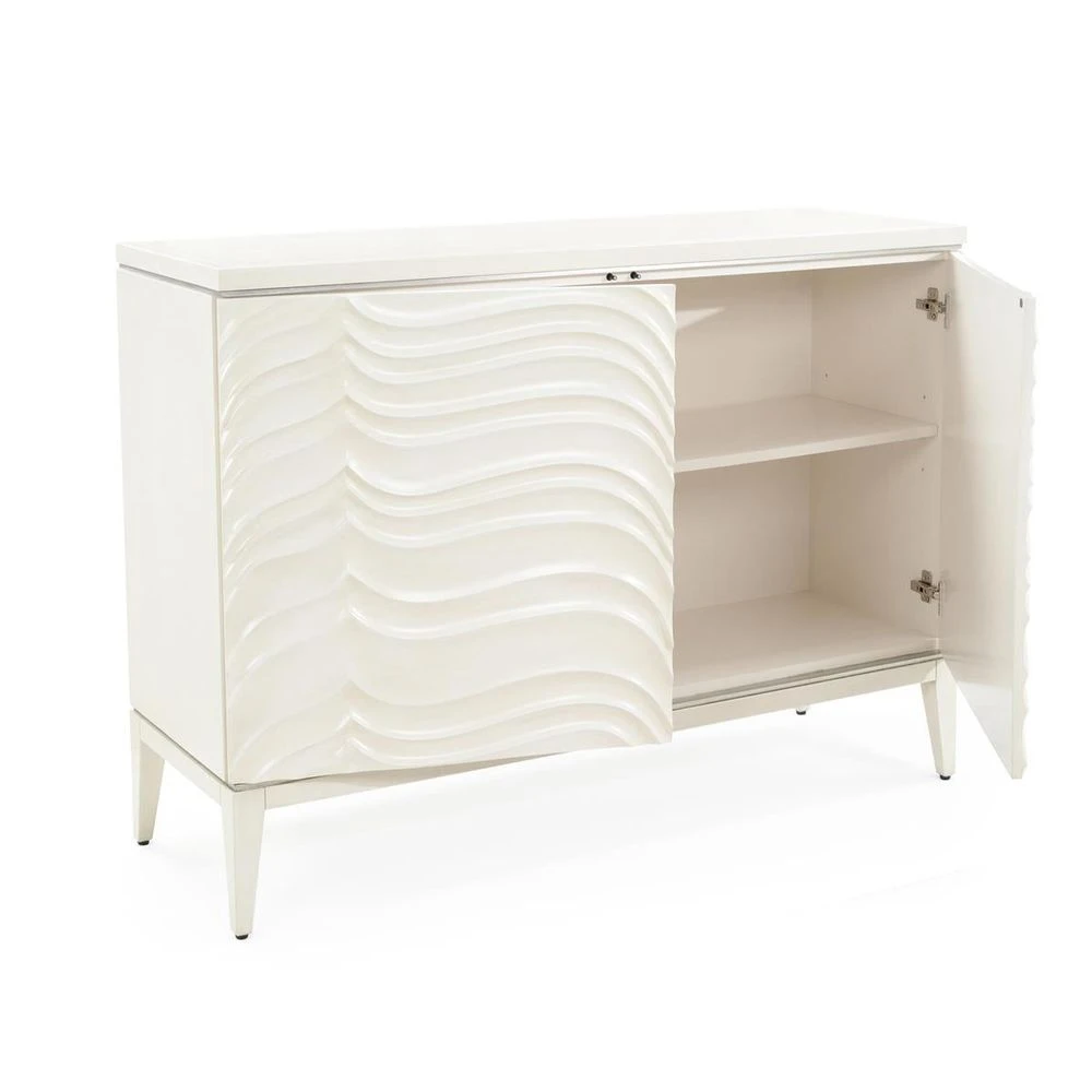 Symmetrical flourishes stretch across the face of the elegant Sovereign Chest, mimicking bundled layers of delicate fabric. The stunning cabinetry of beech wood in an Antique Beluga finish is beautifully paired with metallic Pewter tones present at the bottom of the piece. The refined, neutral tones and classically-inspired design of the Sovereign will feel right at home in a number of different design styles; from contemporary, transitional, and everything in between.
