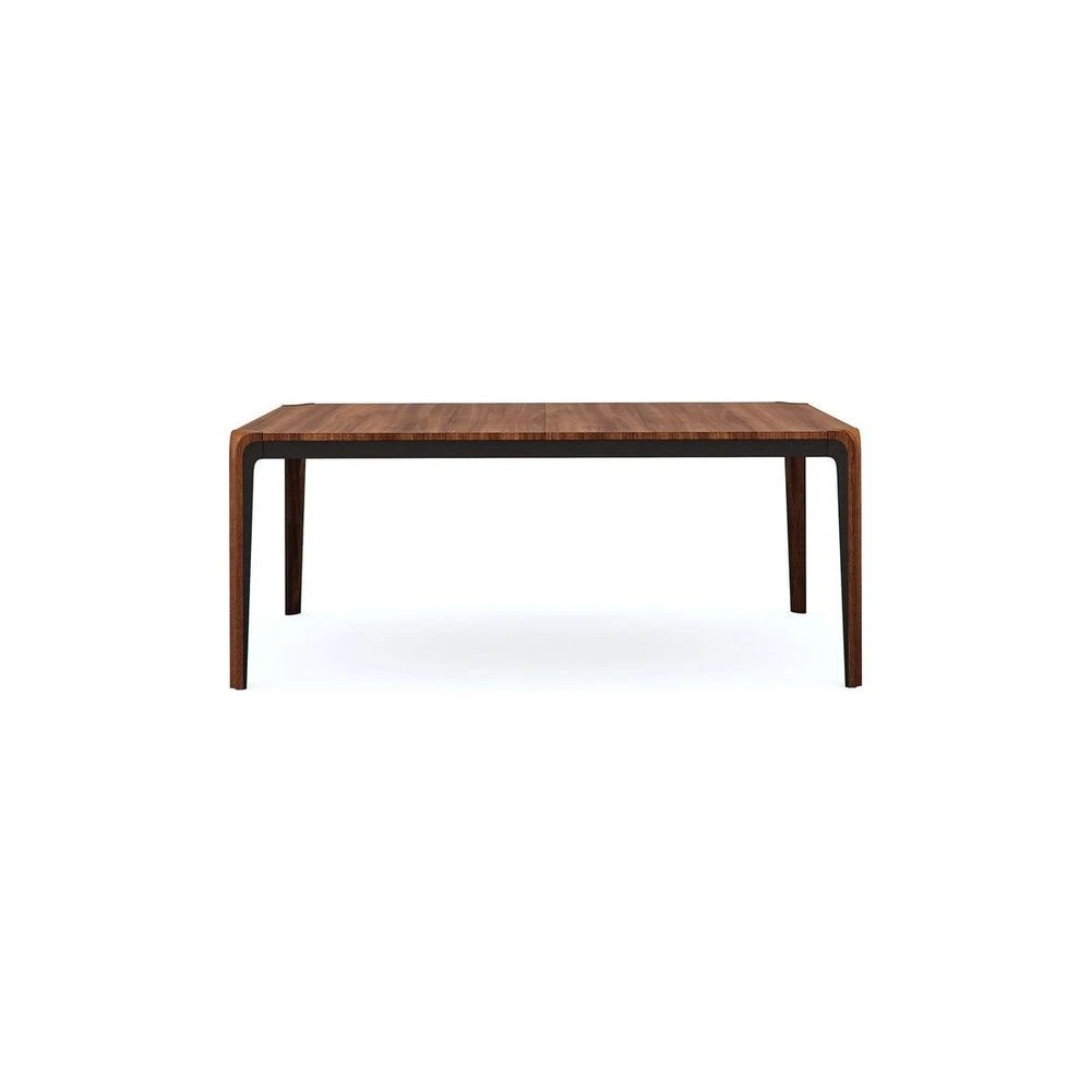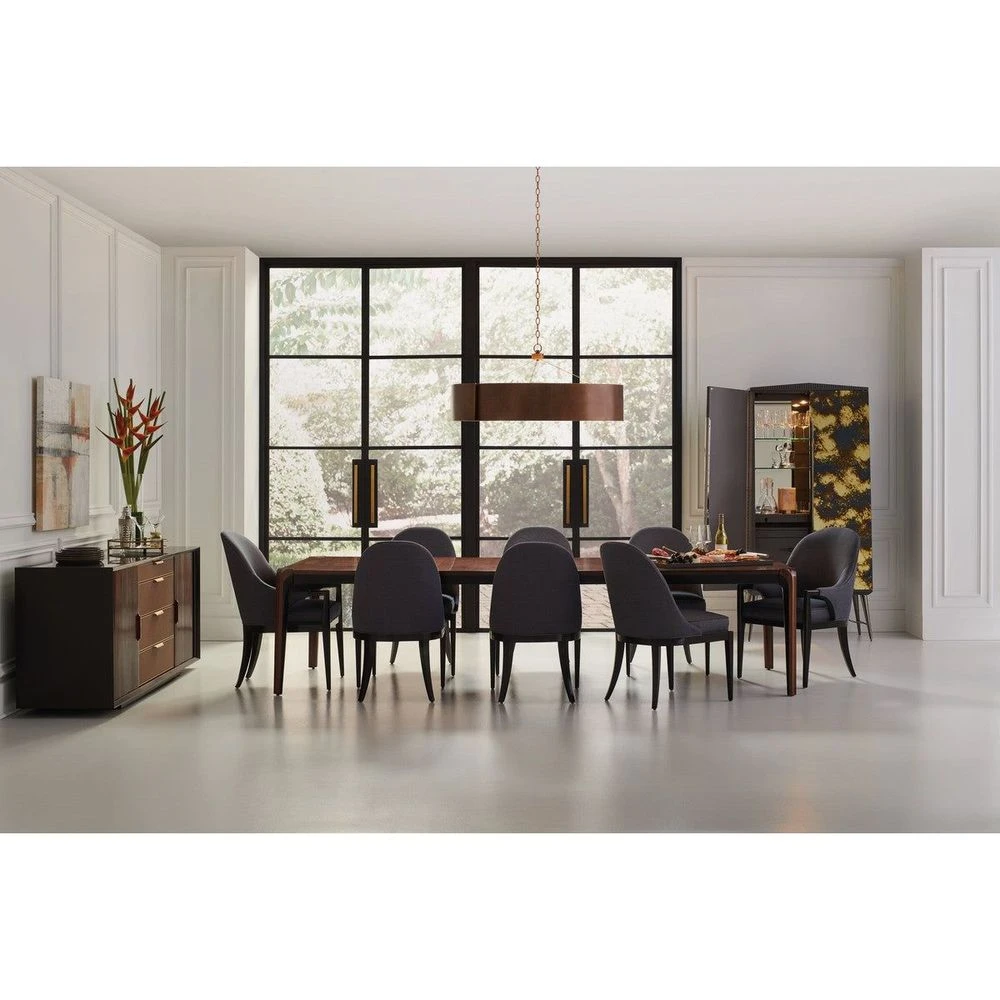 There’s always room for more with this extension dining table, evoking a balance between refined simplicity and modern functionality. Highlighting the intricate wood grain, the tabletop is finished in Rich Walnut with mitered edges in Dark Chocolate. Tapered legs, also trimmed in Dark Chocolate, appear to flow from the tabletop like a waterfall. Comfortably seats 8 without leaves, and seats 14 when fully expanded with three leaves.