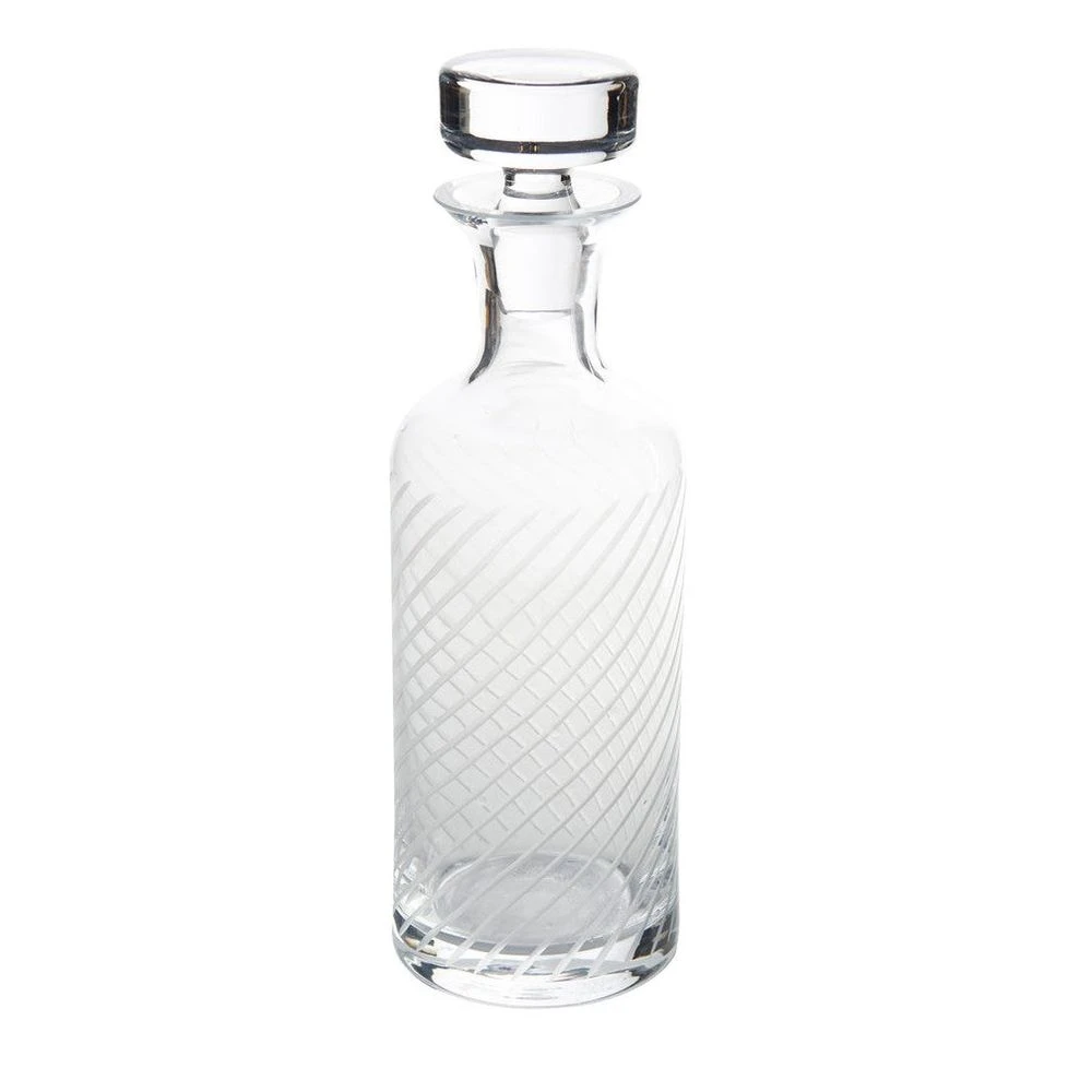 This decanter has a hand-etched diagonal cut pattern and nice heavy stopper. A sophisticated bar accessory. Made in Poland.