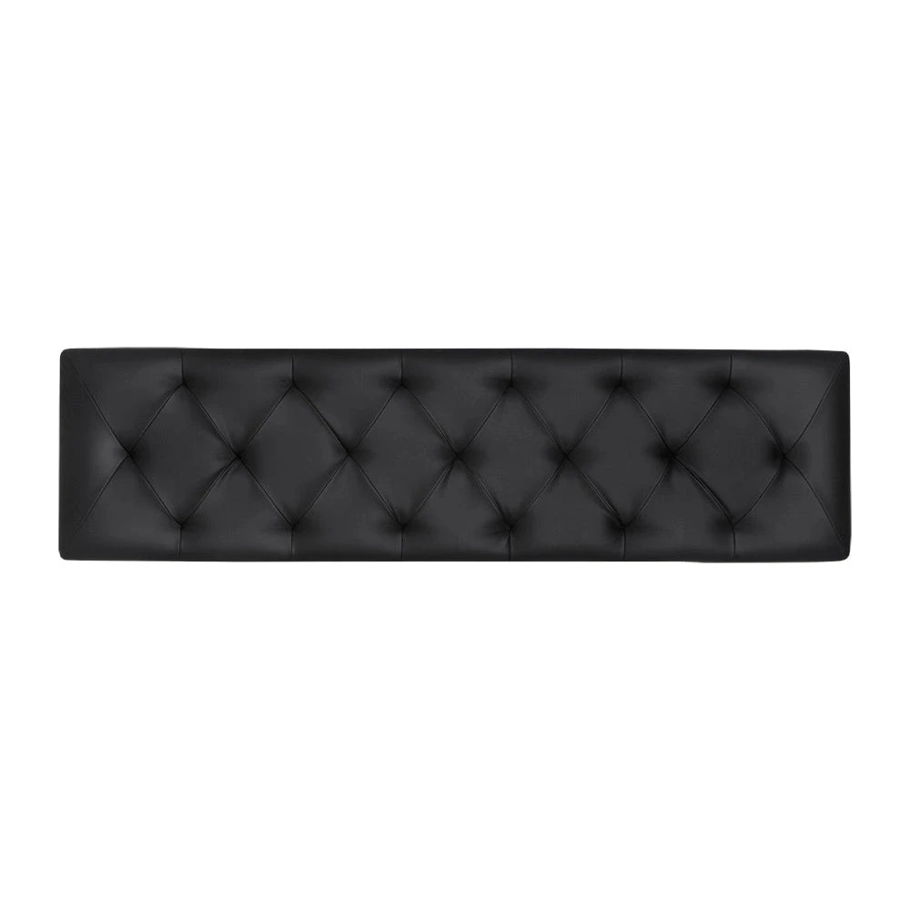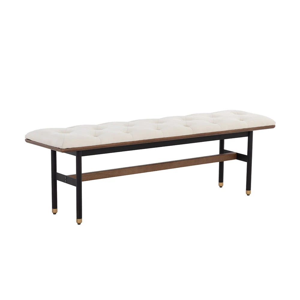 Sophisticated and timeless, this mid-century modern bench includes beautiful summary tufting on the seat. Stocked in black faux leather and paired with a black steel base. Features an accenting solid walnut timber frame and beam on the base. Brass metal caps complete the look. Also available in vienna cream fabric. Handle With Care: This design has been crafted with faux leather. Faux leather is manufactured to reflect the natural characteristics of leather; as such, colour variations, markings, wrinkles, grooves, and light scratches are appreciated characteristics. No two pieces will be alike. Visit our Product Care page for more information on how to ensure the lasting beauty of this piece.