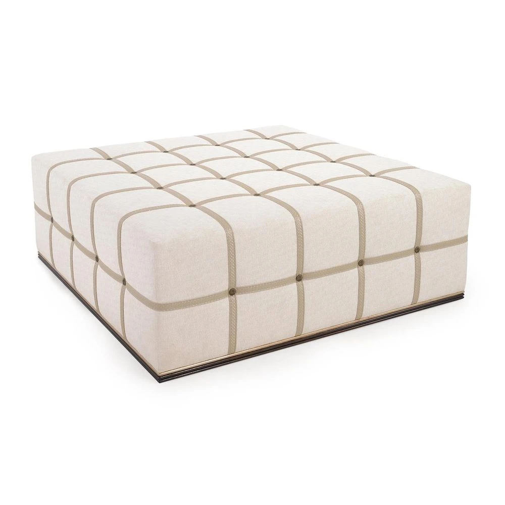 Description: This versatile ottoman is reminiscent of a classic steamer trunk. It is upholstered in a soft pale ivory chenille that is contrasted with straps made from basketweave vegan leather in a metallic champagne color. The straps are anchored with antique brass
