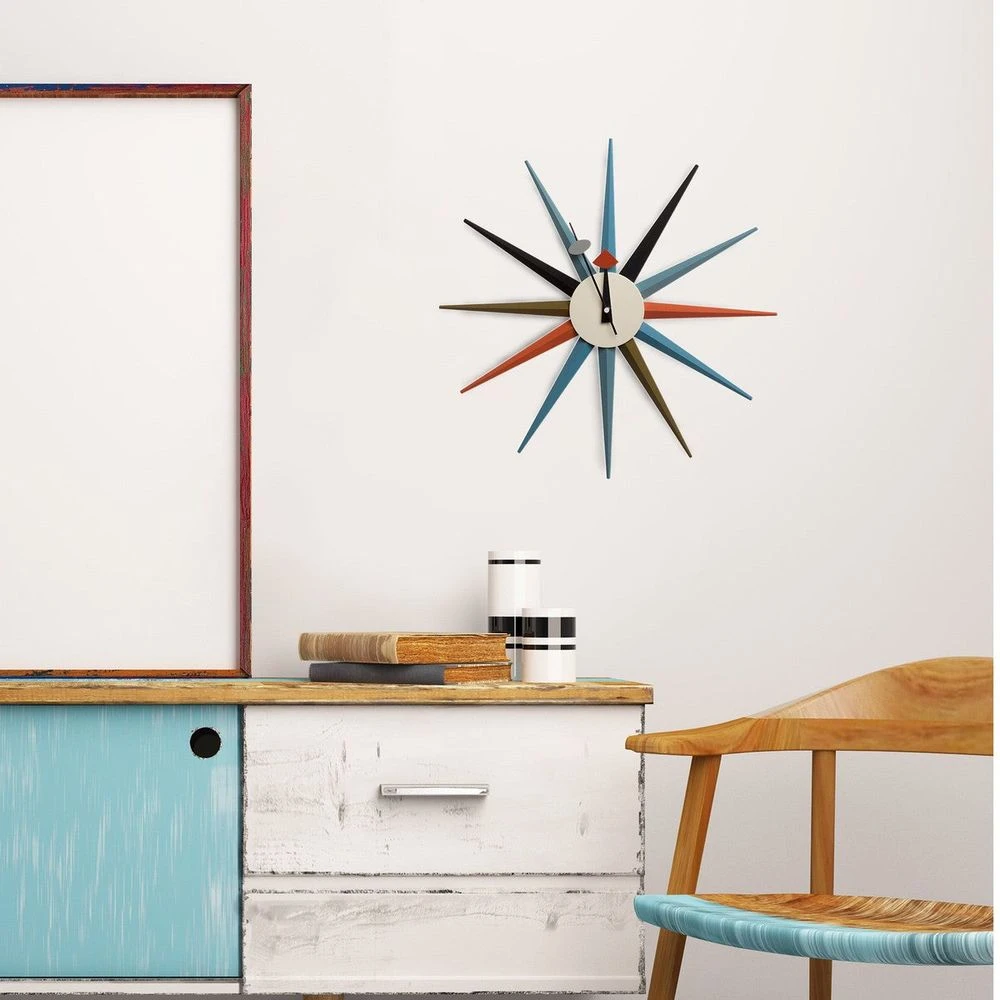 The Sunburst Clock is one of the most recognized clocks in modern day history and provides a bright alternative to the less-than-exciting standard time pieces. This mid century modern wall clock is an icon of modern design. This clock is battery powered with 1 AA battery and has a quartz driven mechanism. These modern wall clocks have an attractive sculptural shape and they are a refreshing alternative to the usual traditional timekeepers.