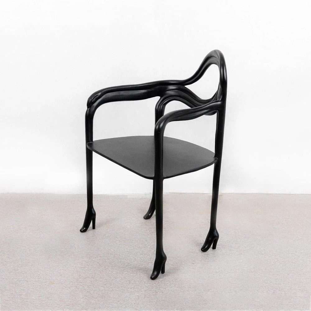 This eye-catching arm chair features a stiletto thin solid cast aluminum frame that curves and loops around to create a functional frame that doubles as a sculpture. The surrealist style culminates with little whimsical feet at the base of each leg that look like little stiletto shoes, and a little hand on the armrest. Add some sophisticated style and character to your space with a truly unique chair that doubles as a sculpture.
