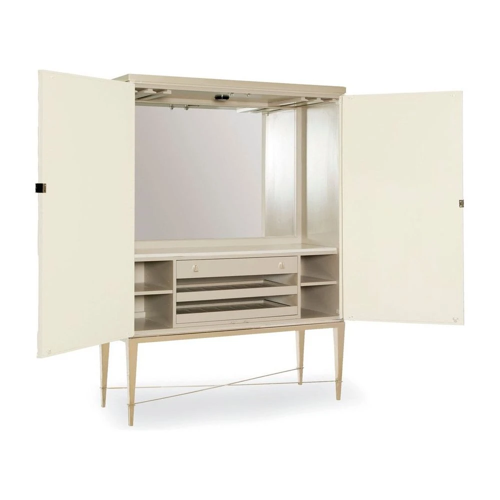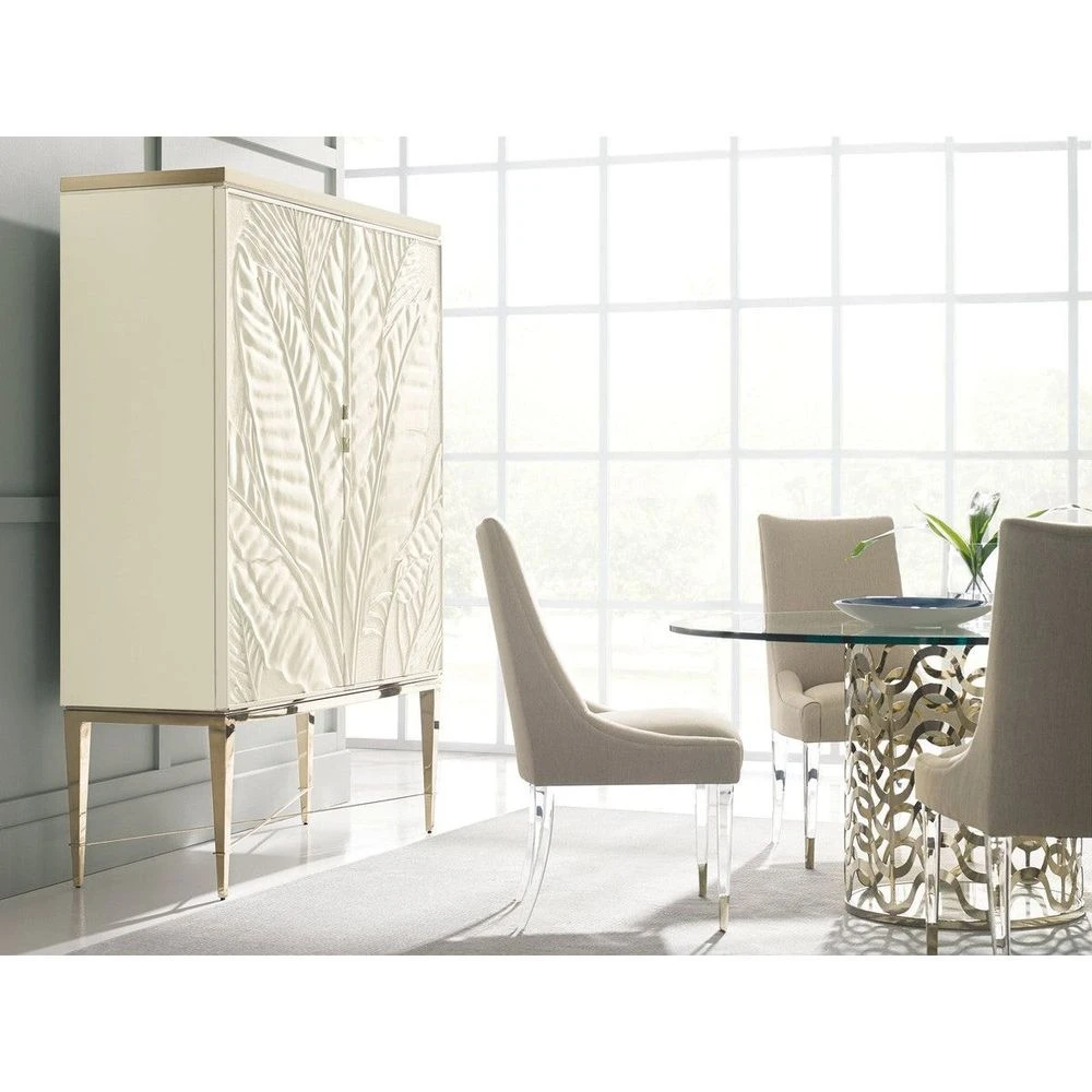 An artistic take on the classic palm tree, Palms Up! provides a stunning focal point for your living or dining room. However, beauty is not just skin deep. Behind the hand-carved doors reside the quintessential bar for entertaining. A white marble work surface sits atop a deep drawer for storing drink making essentials and two open shelves that will cradle your favorite wines. The interior is finished in a Soft Taupe and features a mirrored back with hanging wine glass holder. This closed storage piece truly sets the bar high.