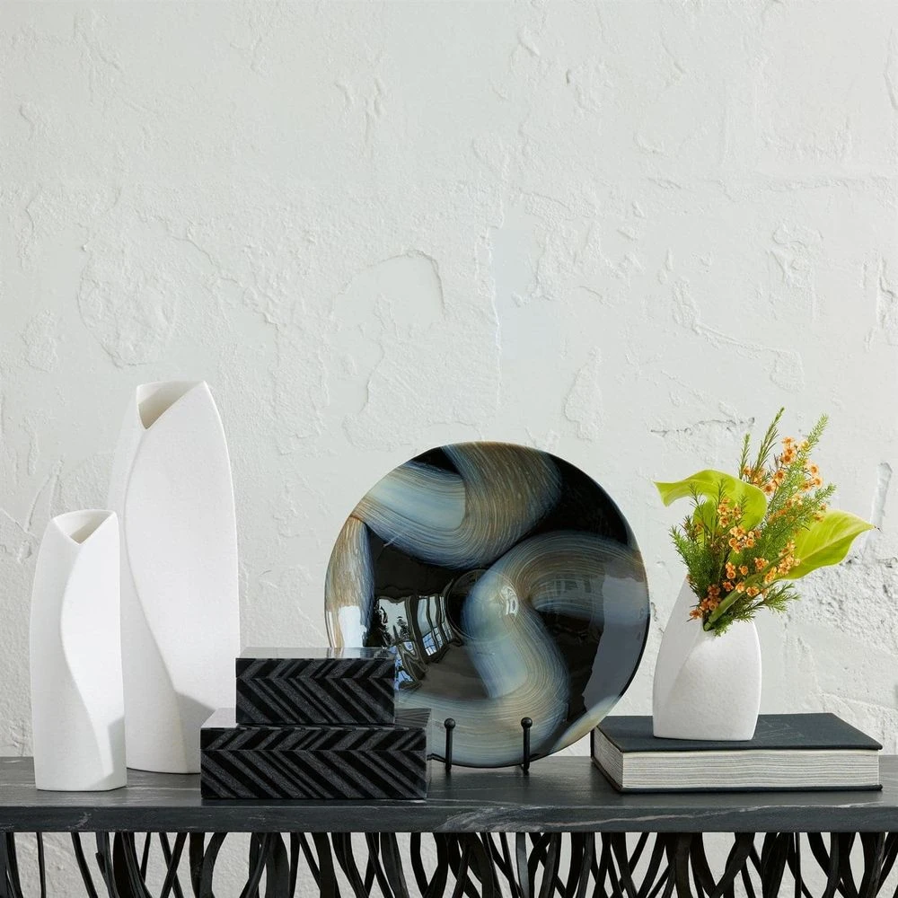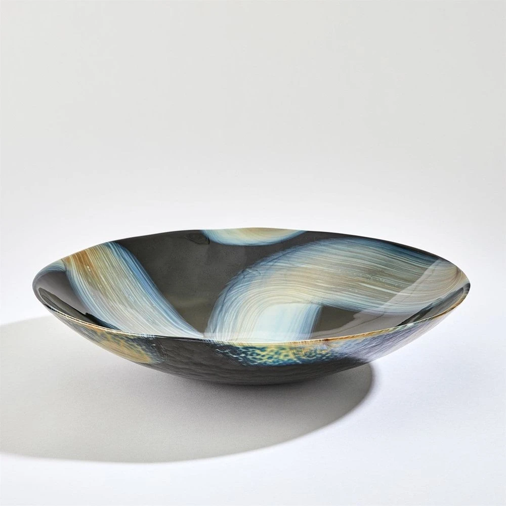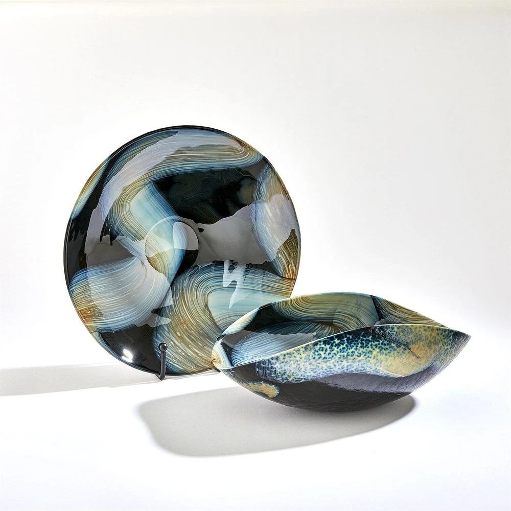Discover the enchanting artistry behind the Swoon Charger and Bowl. Meticulously crafted by skilled Italian glass artisans on the island of Murano, each unique art glass item is born through a distinctive centrifuge process. Molten glass is spun in large copper bowls, shaping and molding take place, followed by precise cutting and reheating. After a thorough annealing process, the glass transforms into a cool, stable masterpiece ready to be displayed as a captivating work of art.