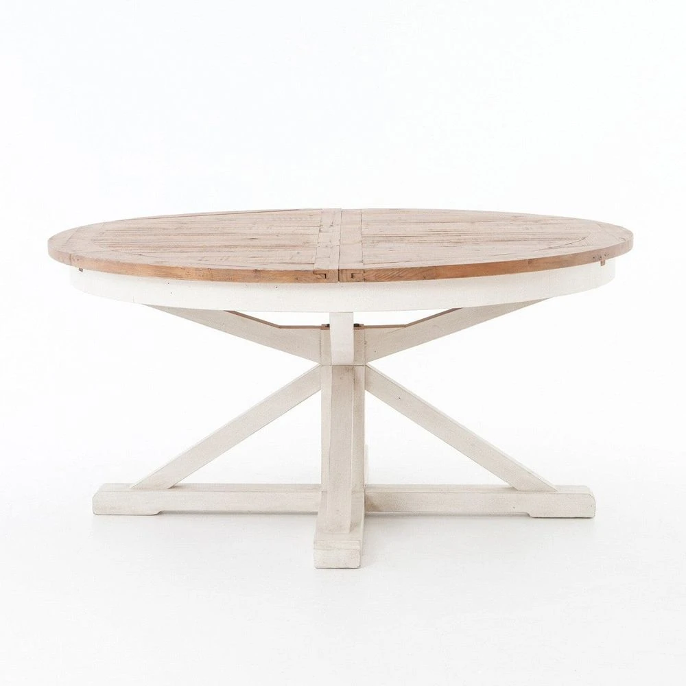 - Description: A welcoming, round farmhouse table draws the eye with organic graining indicative of its reclaimed wood top. A compelling architectural base is finished in limestone white for a clean look. Easily extends to 79″ with built-in leaf.
