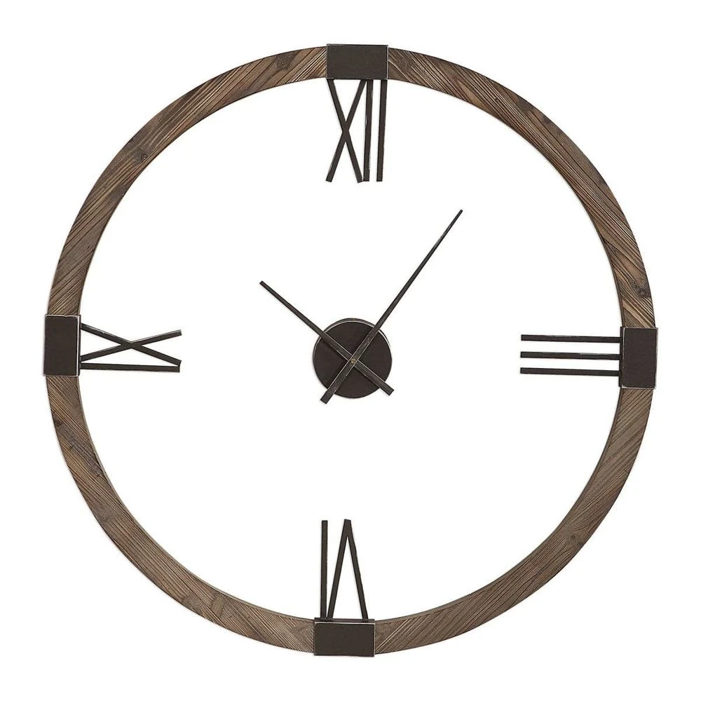 Description: Natural Stained, Fir Wood Clock Frame With Hand Forged, Aged Iron Roman Numerals And Floating Center Dial. Quartz Movement Ensures Accurate Timekeeping. Requires One “AA” Battery.