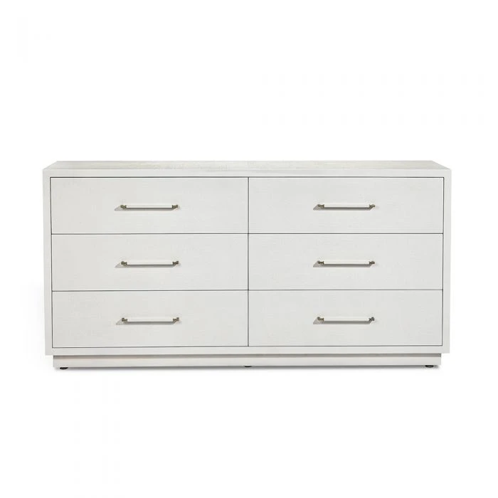The clean lines of the Taylor 6-Drawer Chest are transformed into a statement piece thanks to a surface of natural white faux linen and metal pulls in champagne silver.