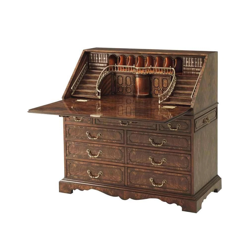 A fine flame veneered bureau, the sloping fall enclosing a fitted interior of faux book and hidden drawers and cabinets, the staircase gallery interior, above a short frieze drawer flanked by dummy drawers, with two short and two long drawers below, on bracket feet; the sides with further drawers and hidden drawers.