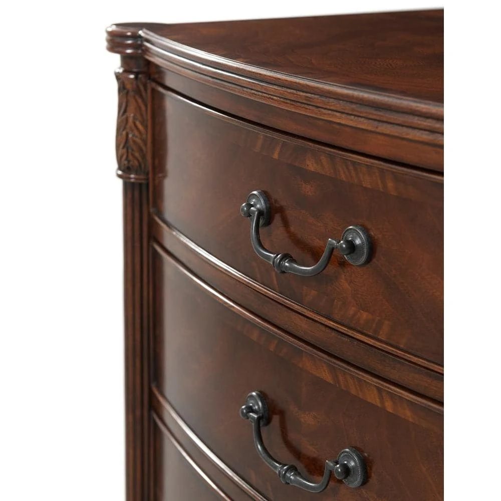 A mahogany and flame veneered nightstand, the reeded edge bowfront top with protruding corners with leaf carved and reeded uprights, with three graduated drawers with verdigris brass handles, raised on turned legs.