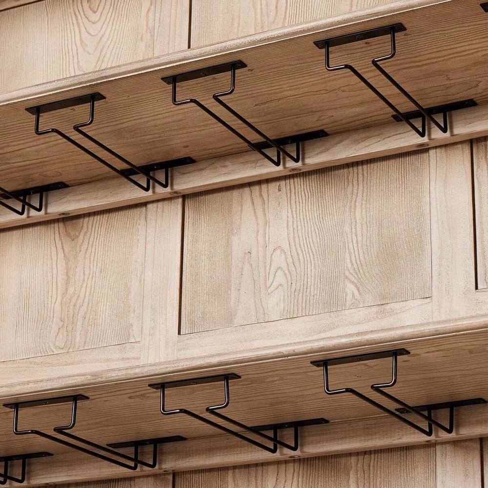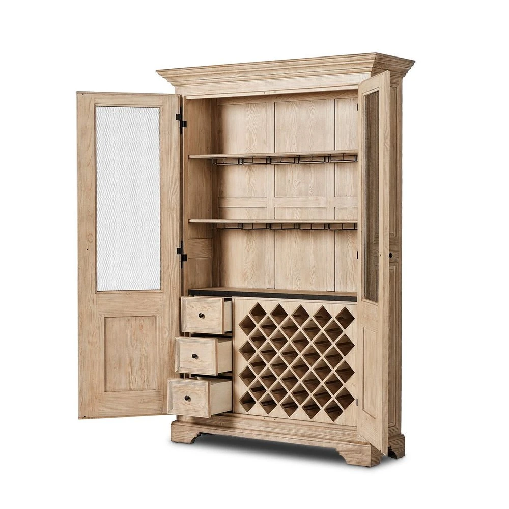 By the makers at Van Thiel, known for their antique-inspired pieces and hand-applied finishes. Influenced by a Scandinavian antique, this grand-scale cabinet features drawers and 12-inch depth wine storage î perfectly sized for standard bottles î all behind bronze mesh doors. Features subtle distressing throughout for the look of an heirloom.