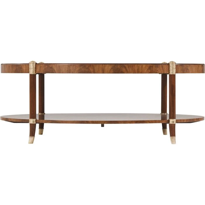 A flame Cerejeira veneered and parquetry crossbanded cocktail table, the oval caddy molded top centered by an amboyna burl veneered oval. Theodore Alexander is shaped by English Heritage handcrafts furniture and accessories for your home with uncompromising quality. They also believe that the person who owns a piece of Theodore Alexander Furniture should take comfort in knowing the item can be viewed from any side and they have made the piece by using a time-honored, handcrafted method that is the true mark of high quality. Every piece of Theodore Alexander has a story just waiting to be shared.